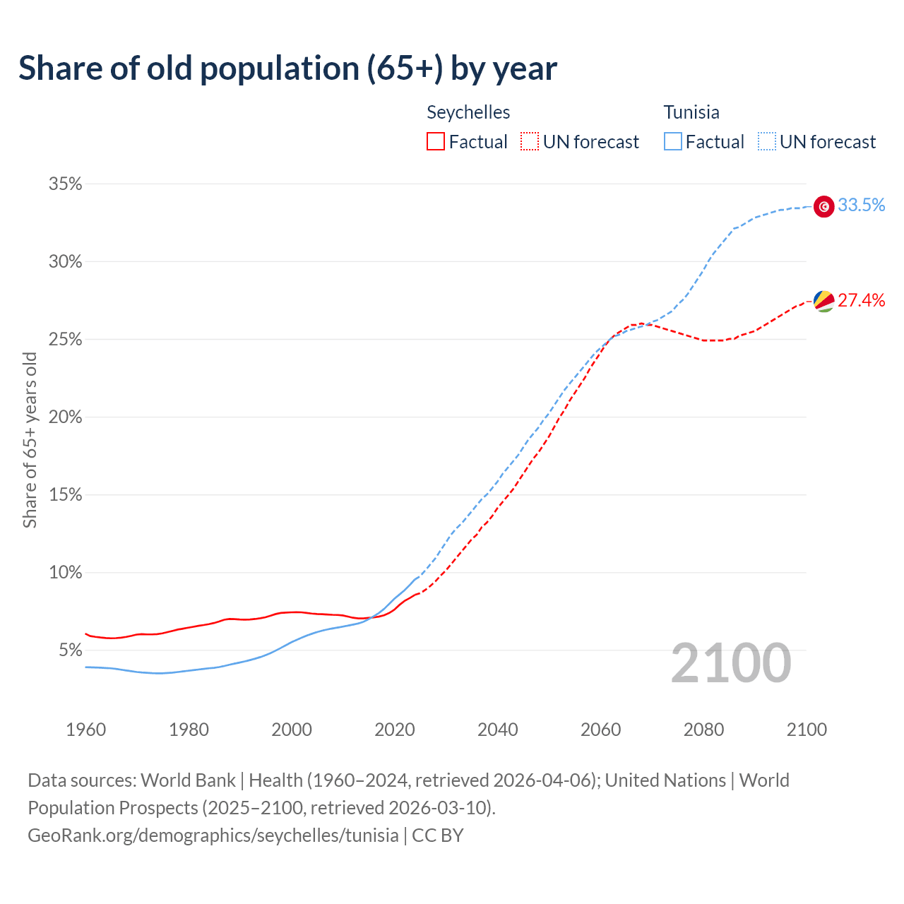 - The share of old-age demographic (65+) in the Seychelles is 8.54% vs 9.53% in Tunisia.