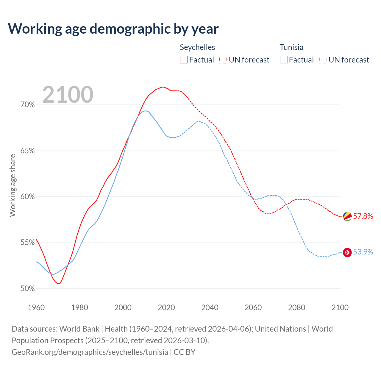- The Seychelles has 90.3K working age adults (aged 15-64) vs 8.26M in Tunisia.