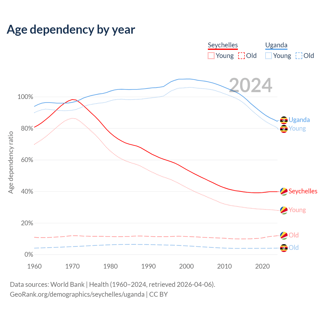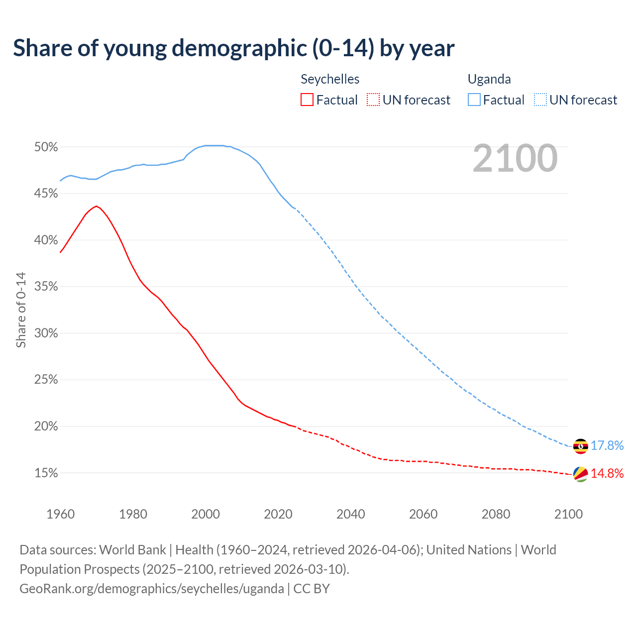 - The share of young demographic (0-15 years old) in the Seychelles is 20% vs 43.5% in Uganda.