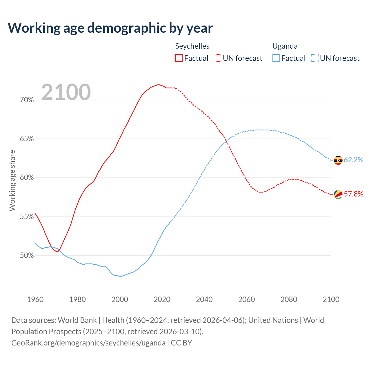 - The Seychelles has 90.3K working age adults (aged 15-64) vs 28.9M in Uganda.