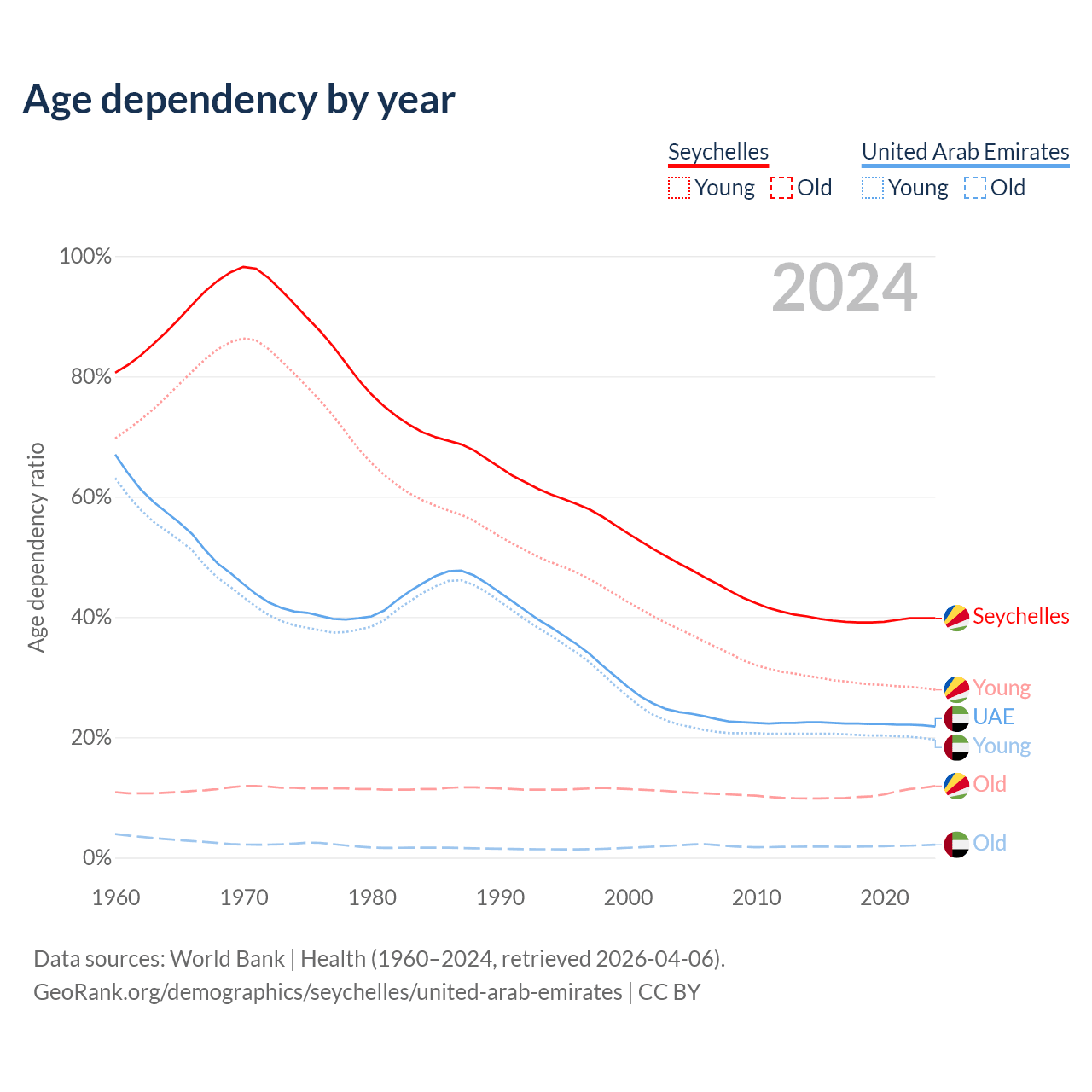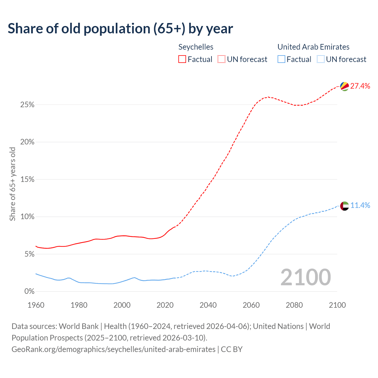 The share of older people aged 65 and over is 8.54% in the Seychelles and 1.77% in the United Arab Emirates. Life expectancy in the Seychelles compared to the United Arab Emirates .
