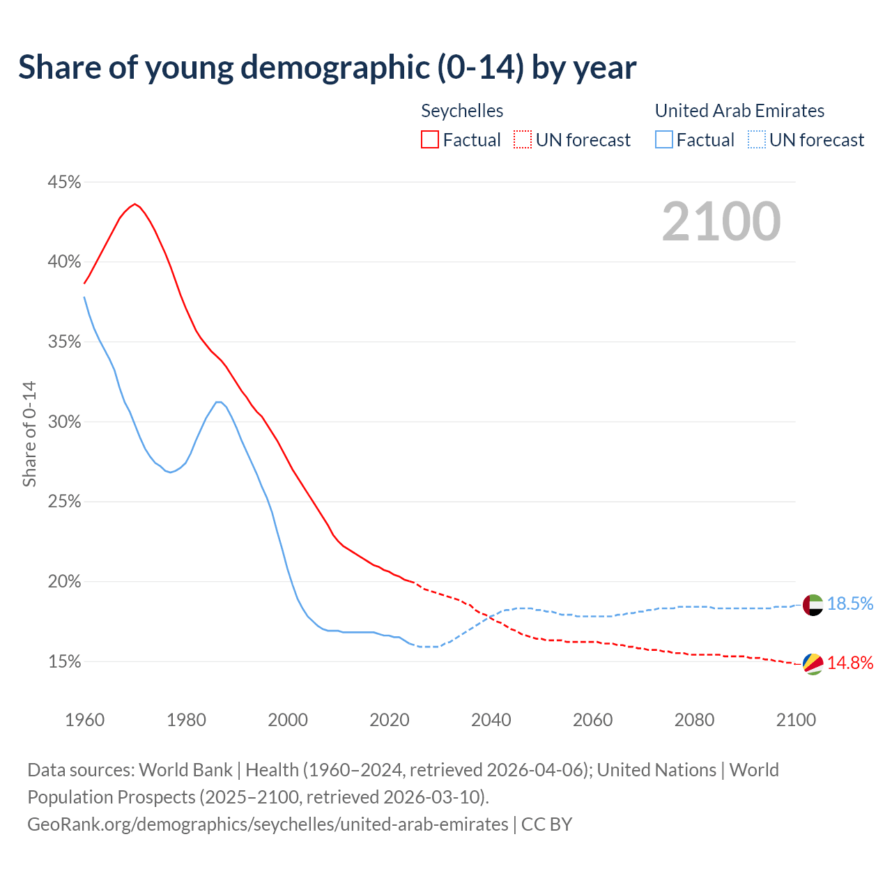 - The share of young demographic (0-15 years old) in the Seychelles is 20% vs 16.1% in the United Arab Emirates.