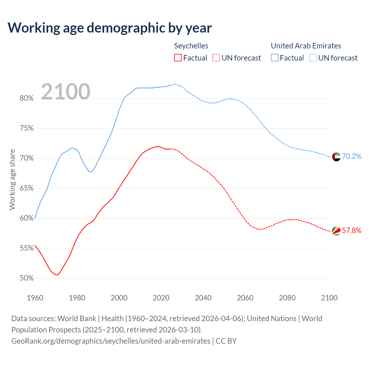 - The Seychelles has 90.3K working age adults (aged 15-64) vs 9.6M in the United Arab Emirates.