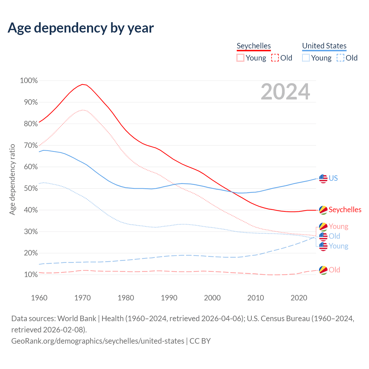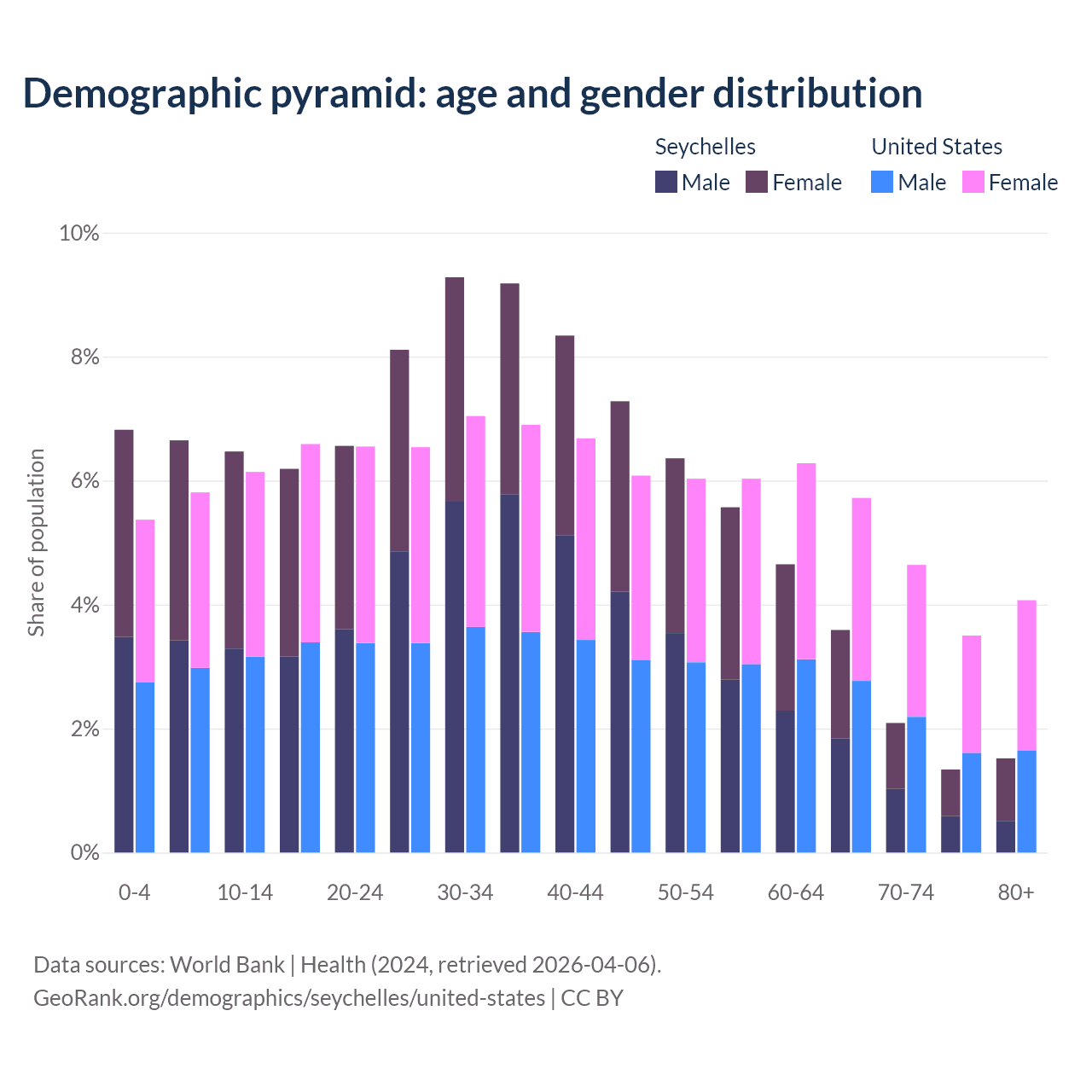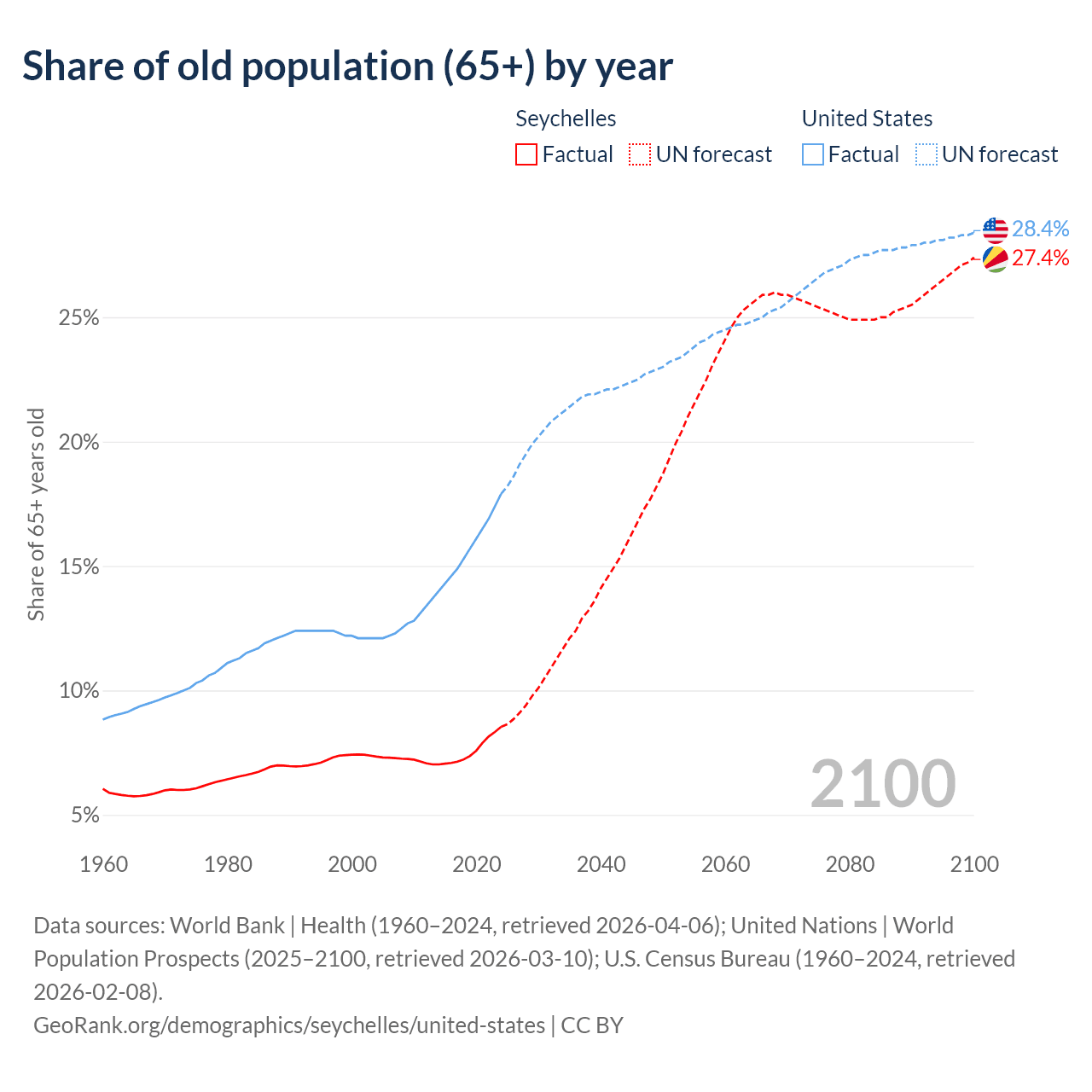 The share of older people aged 65 and over is 8.54% in the Seychelles and 17.9% in the United States. Life expectancy in the Seychelles compared to the United States .