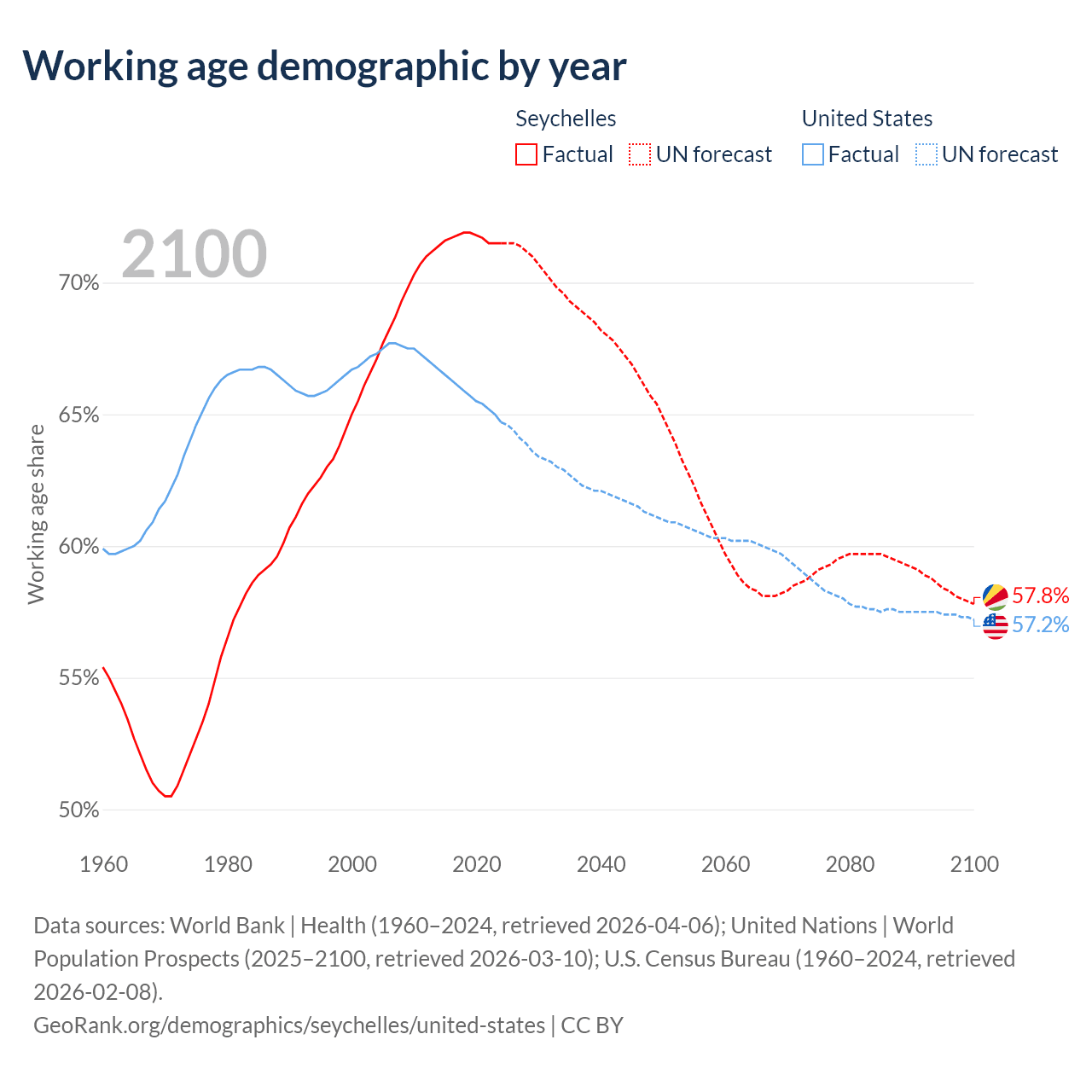 Median age Seychelles vs United States, 1960-2100