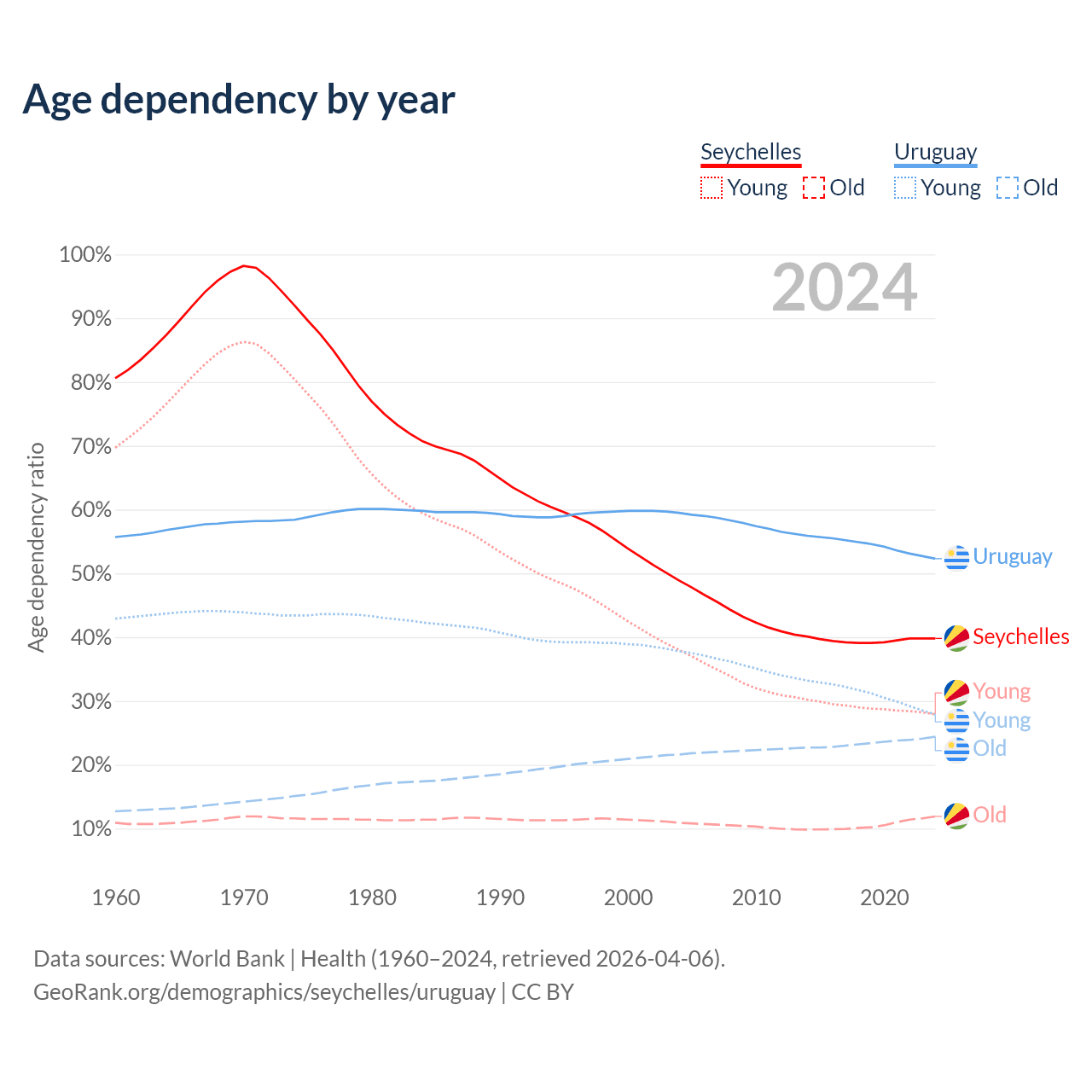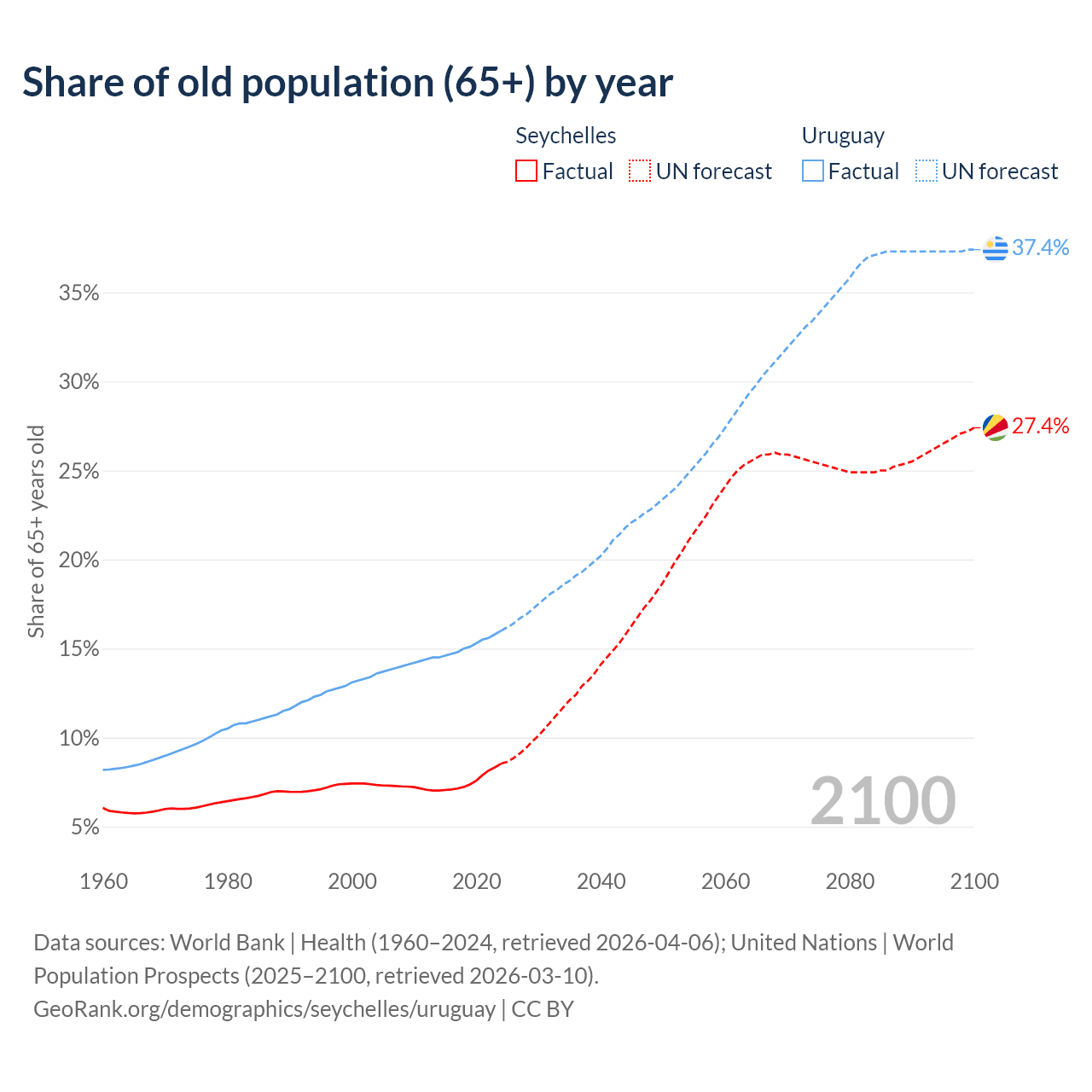 The share of older people aged 65 and over is 8.54% in the Seychelles and 16% in Uruguay. Life expectancy in the Seychelles compared to Uruguay .
