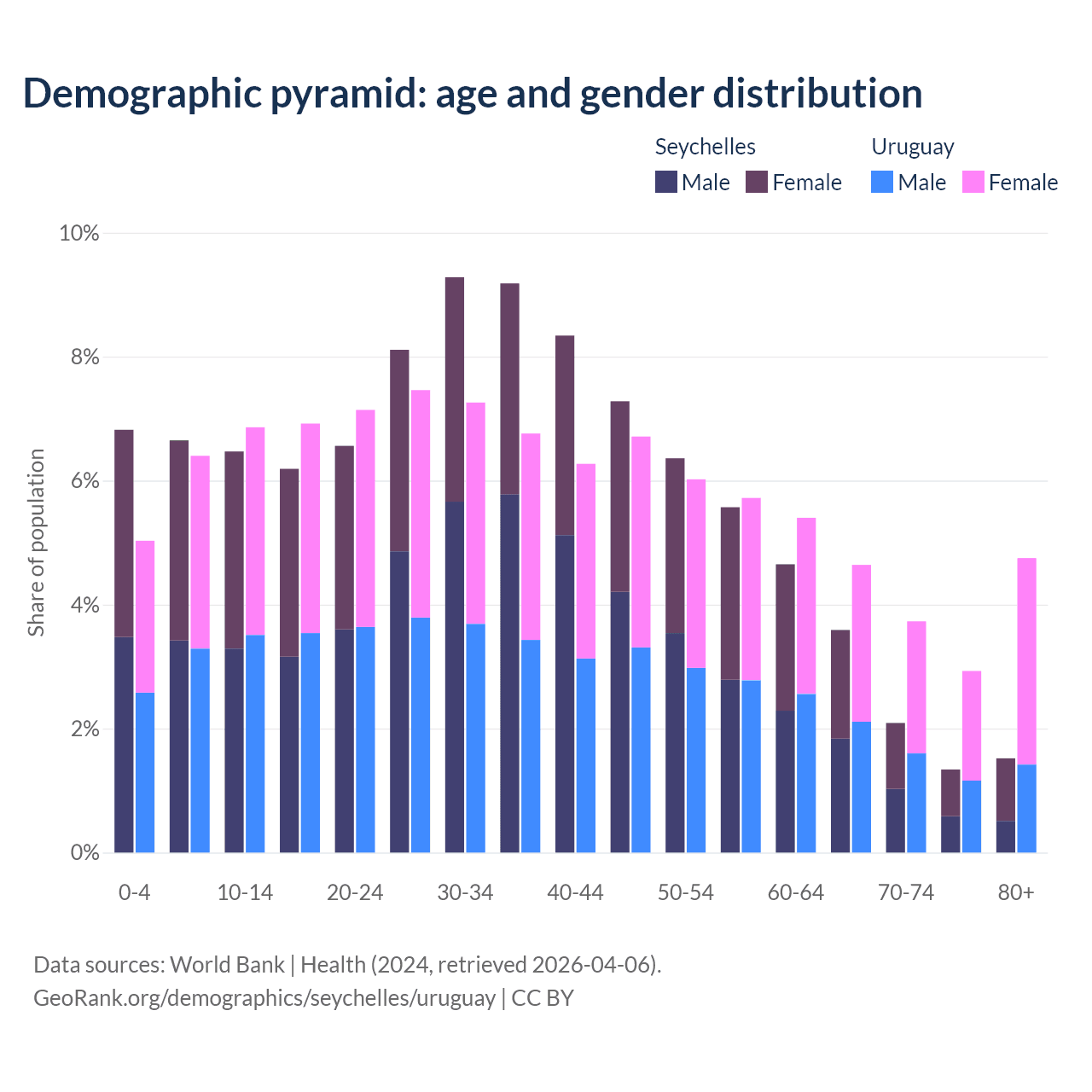 - The Seychelles is ranked 76/196 by median age (oldest to youngest) vs 63/196 for Uruguay.