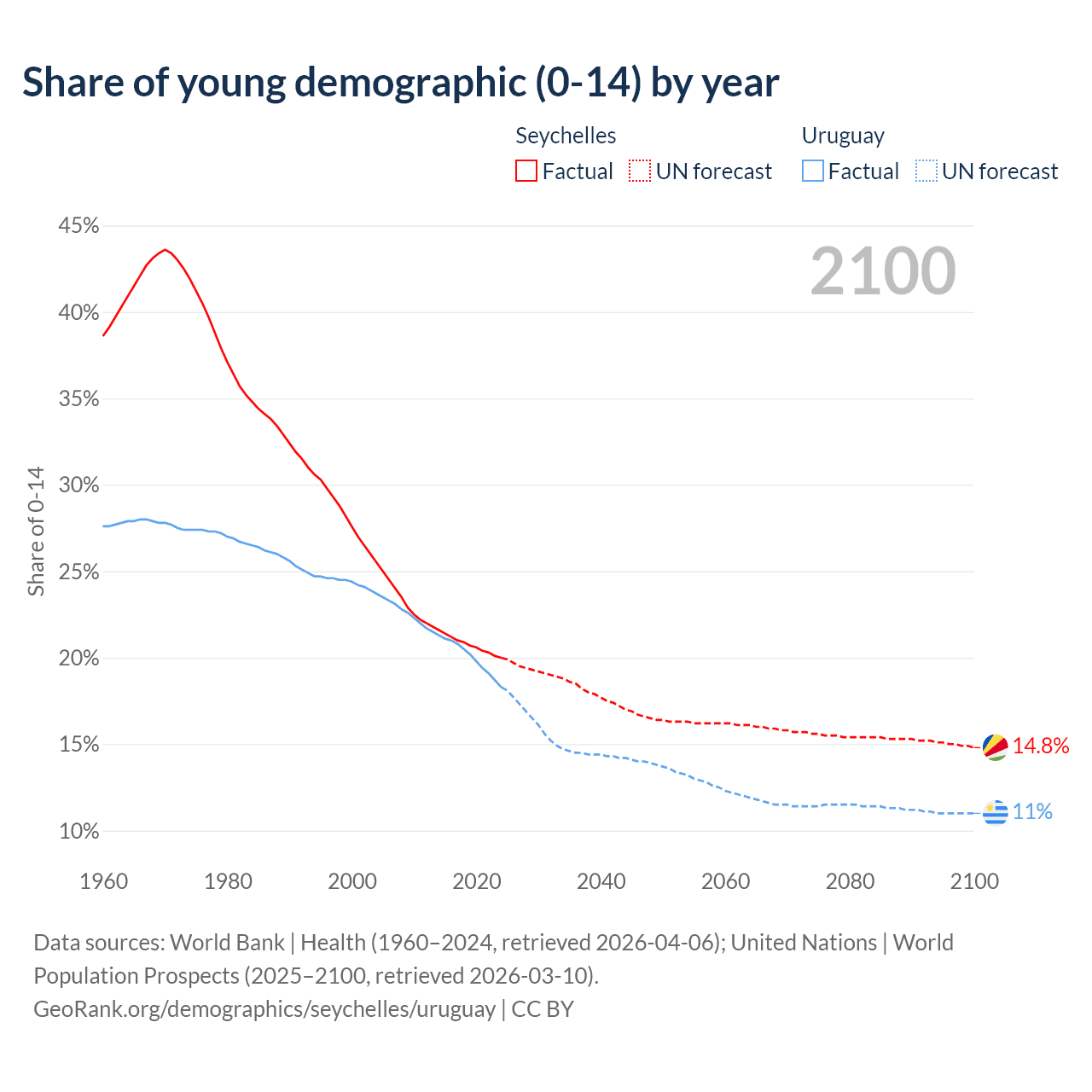- The share of young demographic (0-15 years old) in the Seychelles is 20% vs 18.3% in Uruguay.