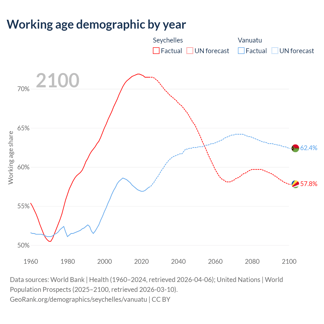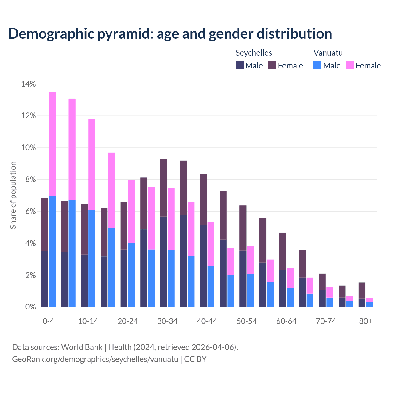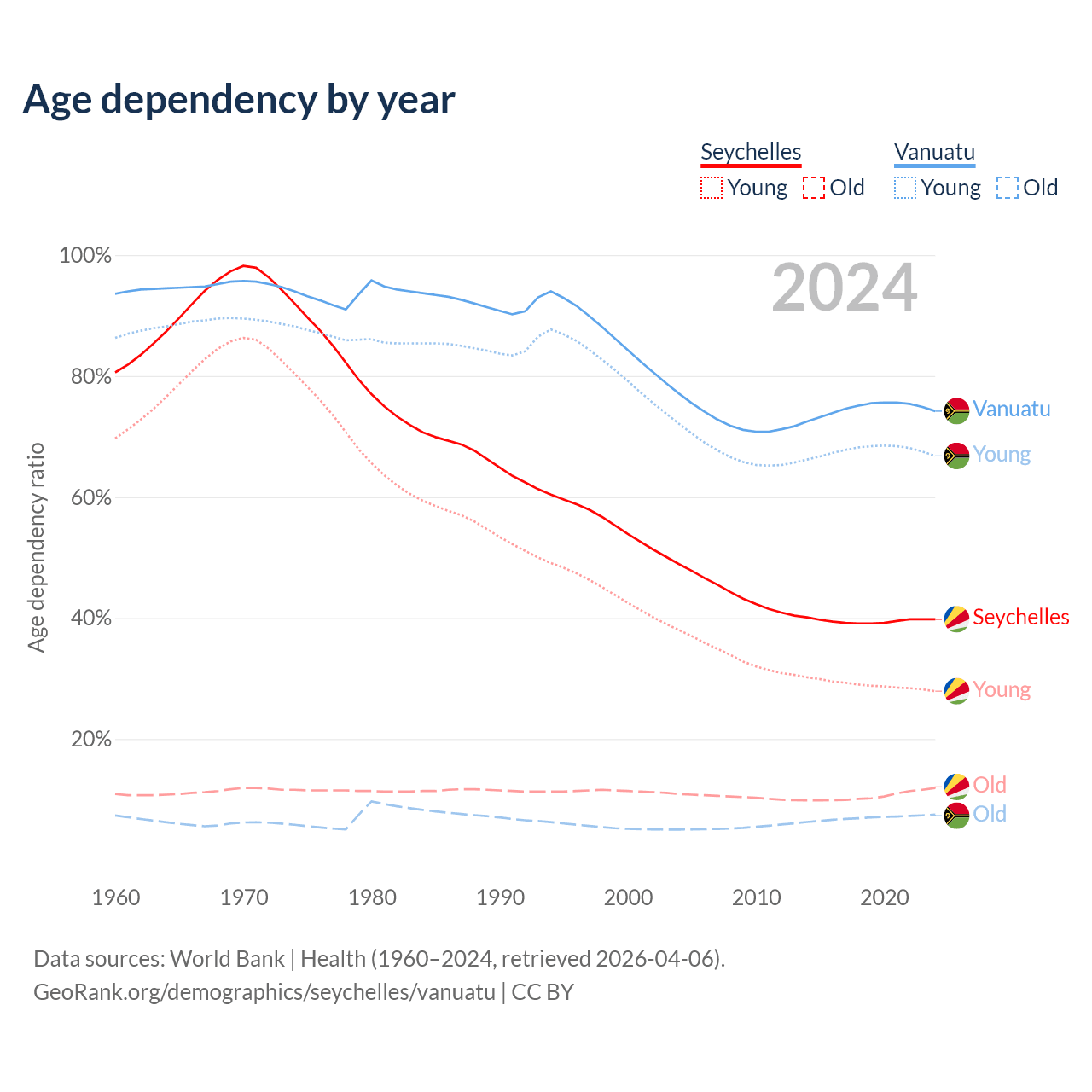 - The share of young demographic (0-15 years old) in the Seychelles is 20% vs 38.3% in Vanuatu.