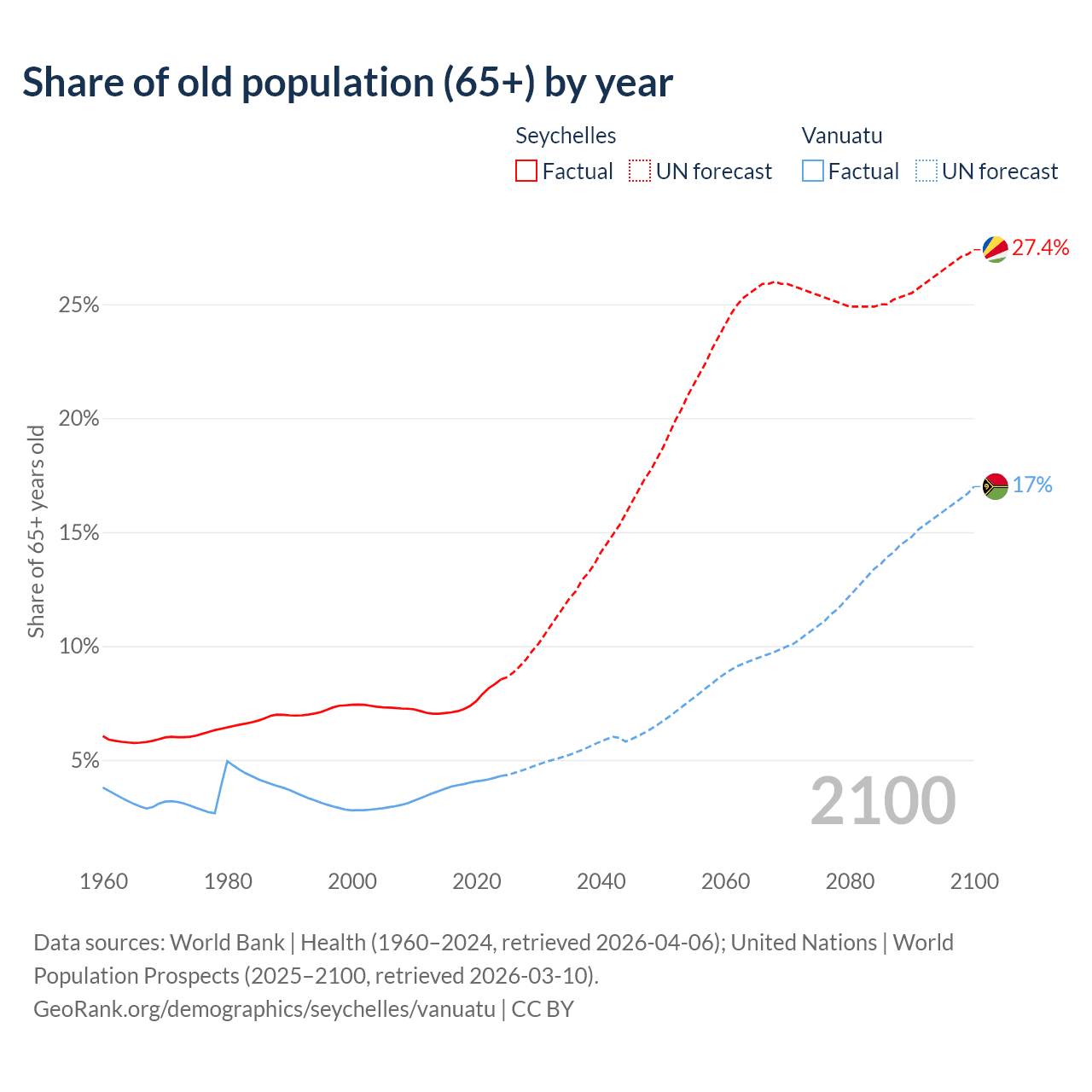 The share of older people aged 65 and over is 8.54% in the Seychelles and 4.3% in Vanuatu. Life expectancy in the Seychelles compared to Vanuatu .