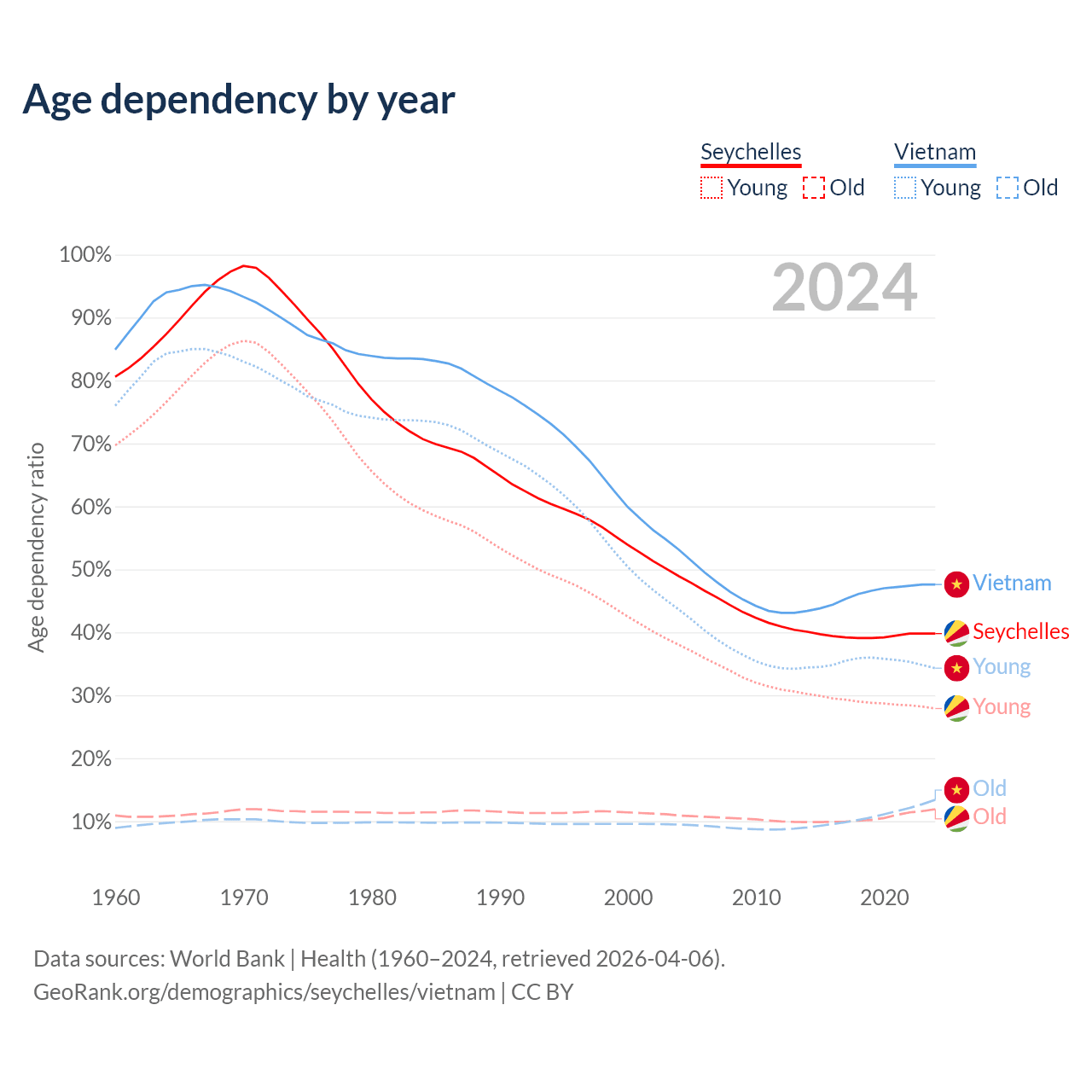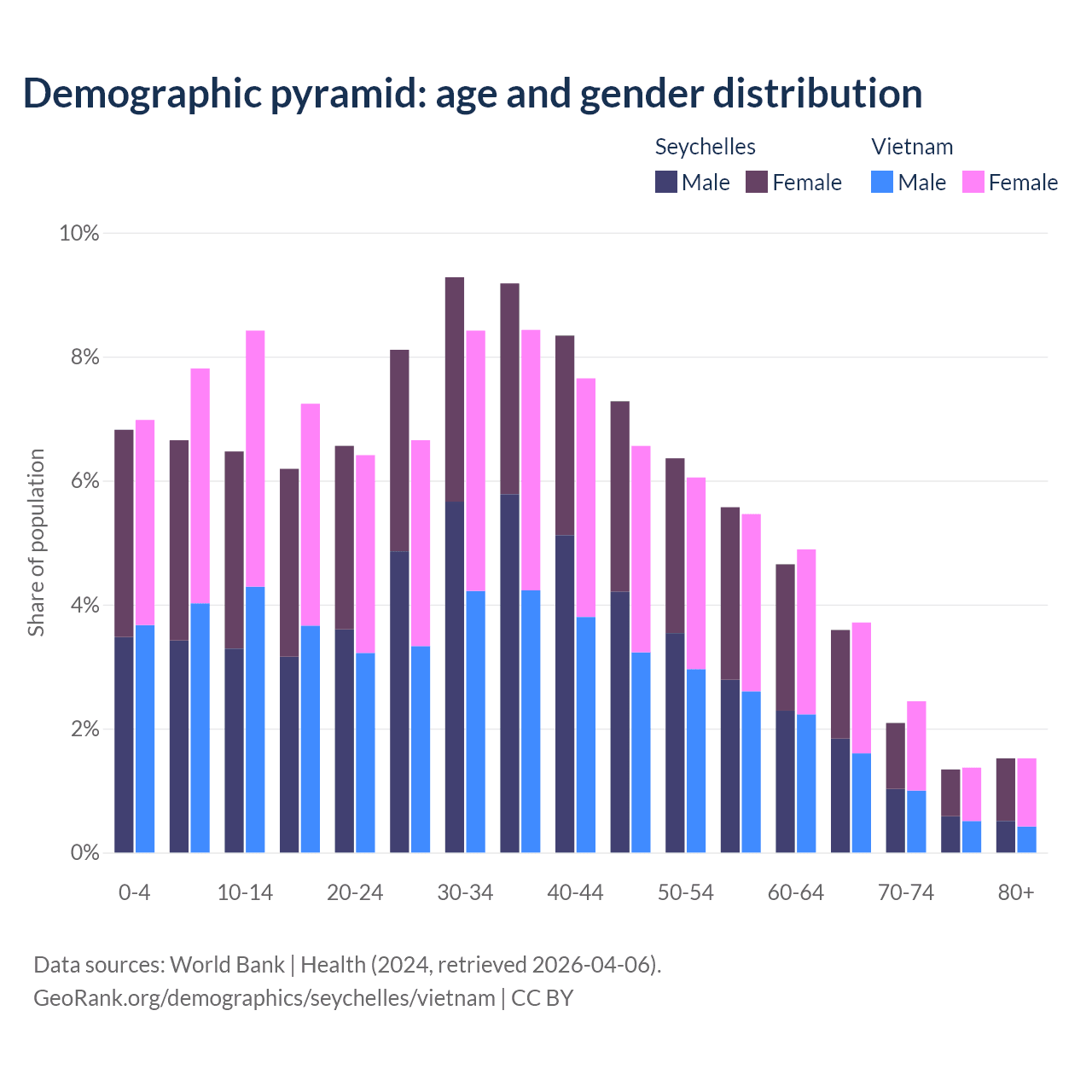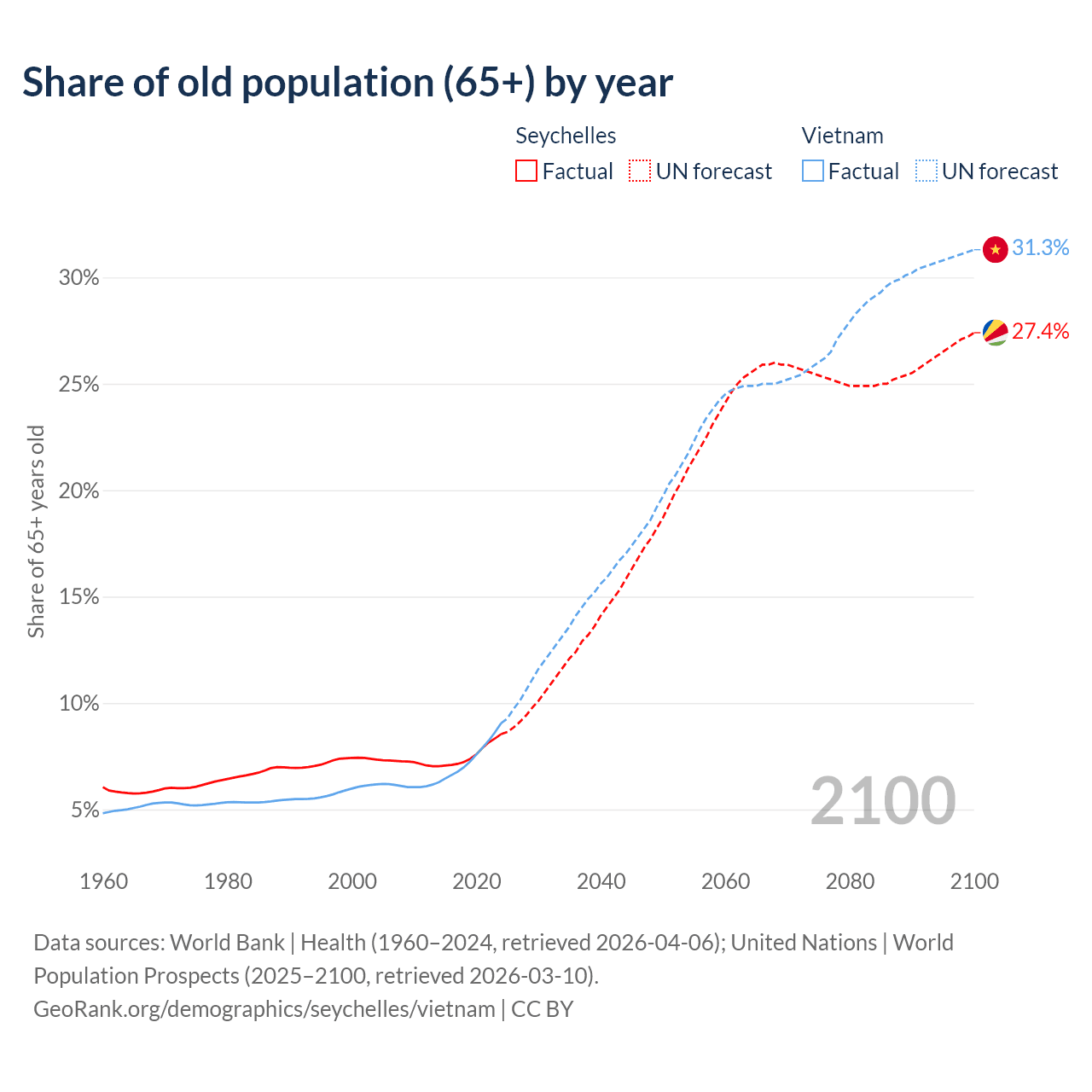 The share of older people aged 65 and over is 8.54% in the Seychelles and 9.05% in Vietnam. Life expectancy in the Seychelles compared to Vietnam .