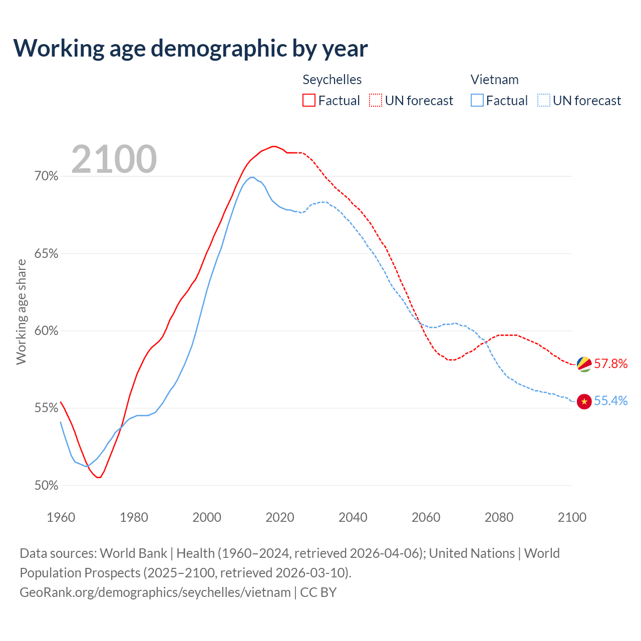 - The Seychelles has 90.3K working age adults (aged 15-64) vs 69.3M in Vietnam.