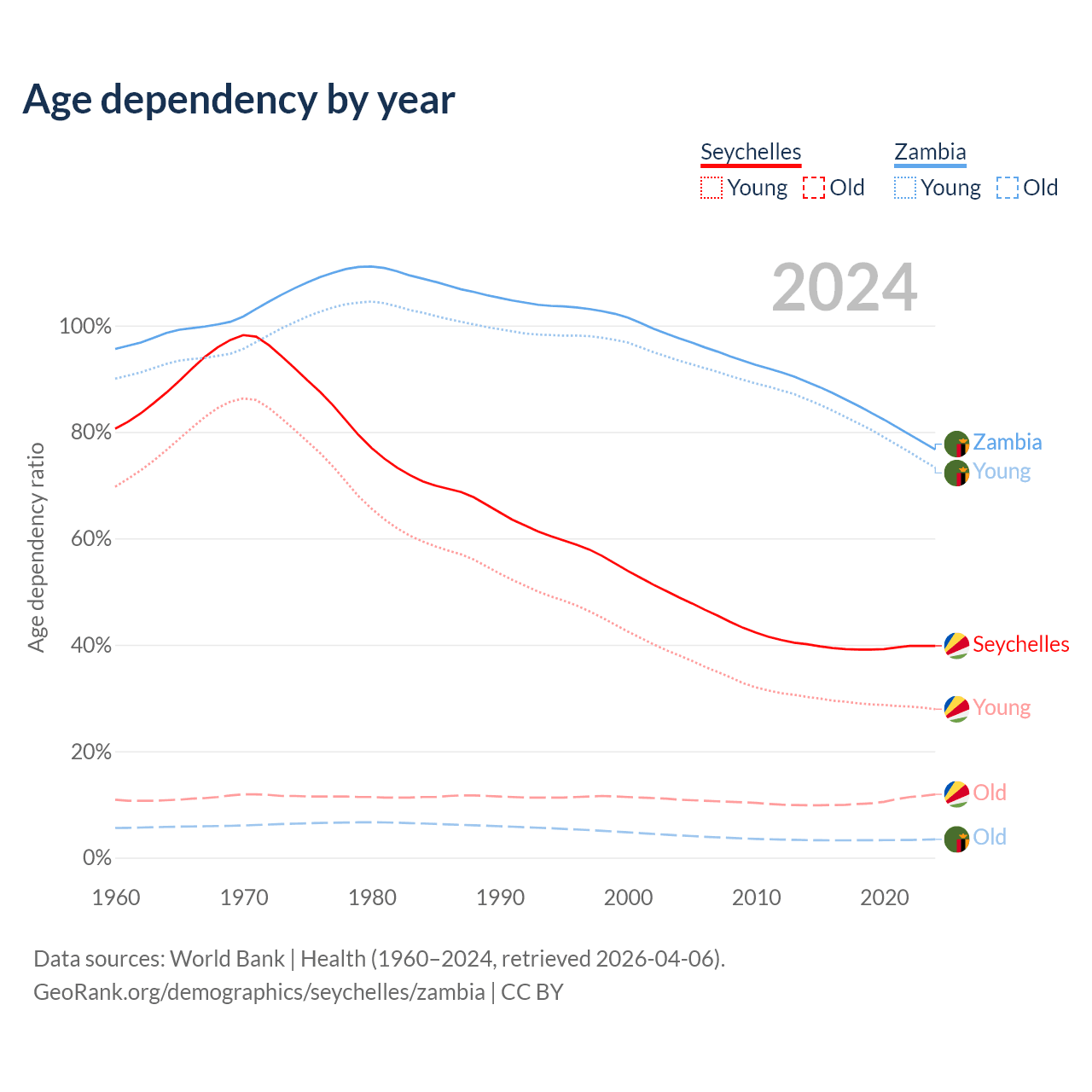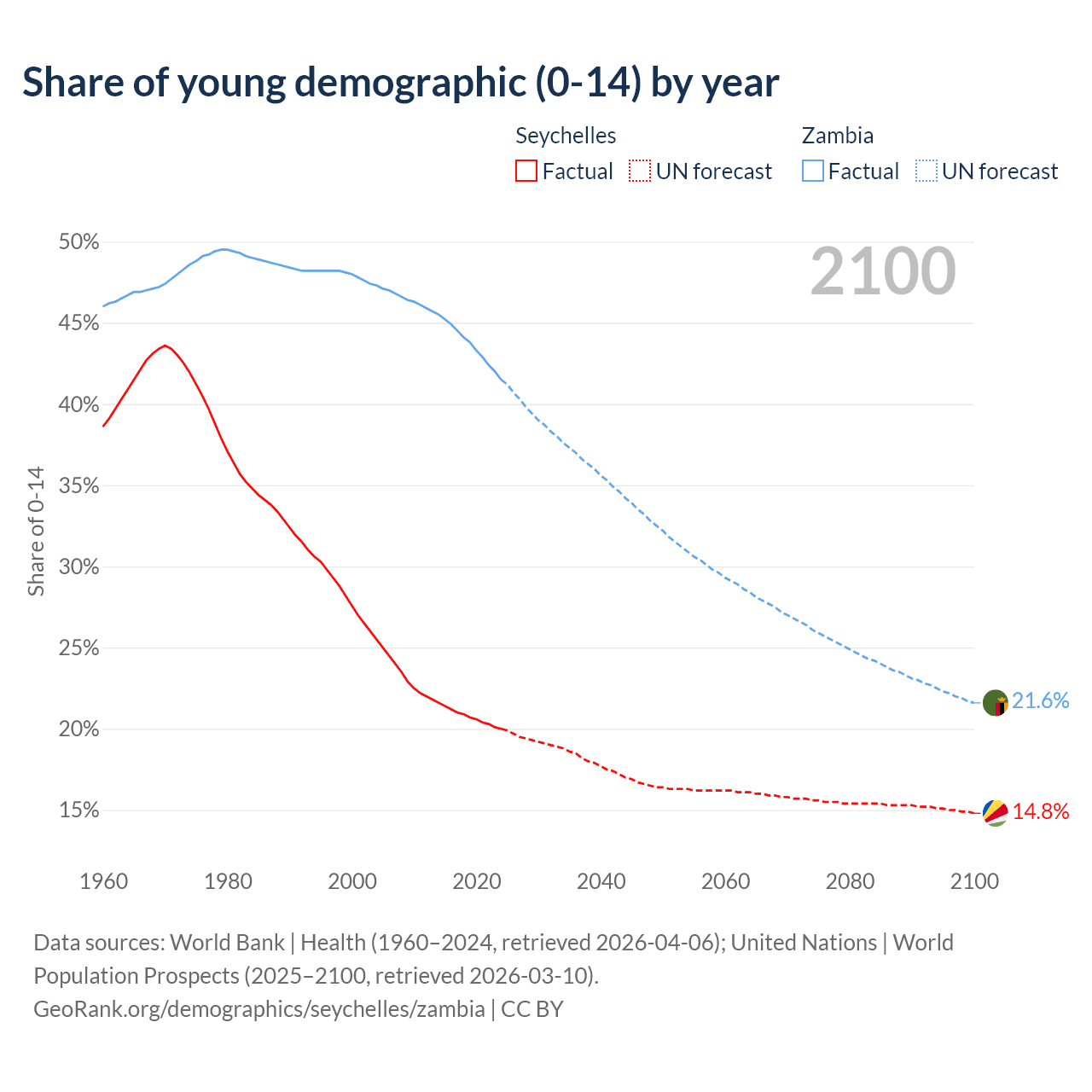 - The share of young demographic (0-15 years old) in the Seychelles is 20% vs 41.5% in Zambia.