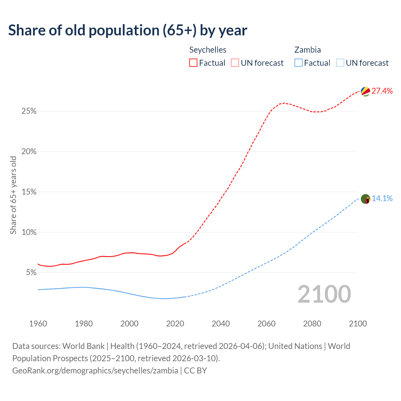 The share of older people aged 65 and over is 8.54% in the Seychelles and 1.95% in Zambia. Life expectancy in the Seychelles compared to Zambia .