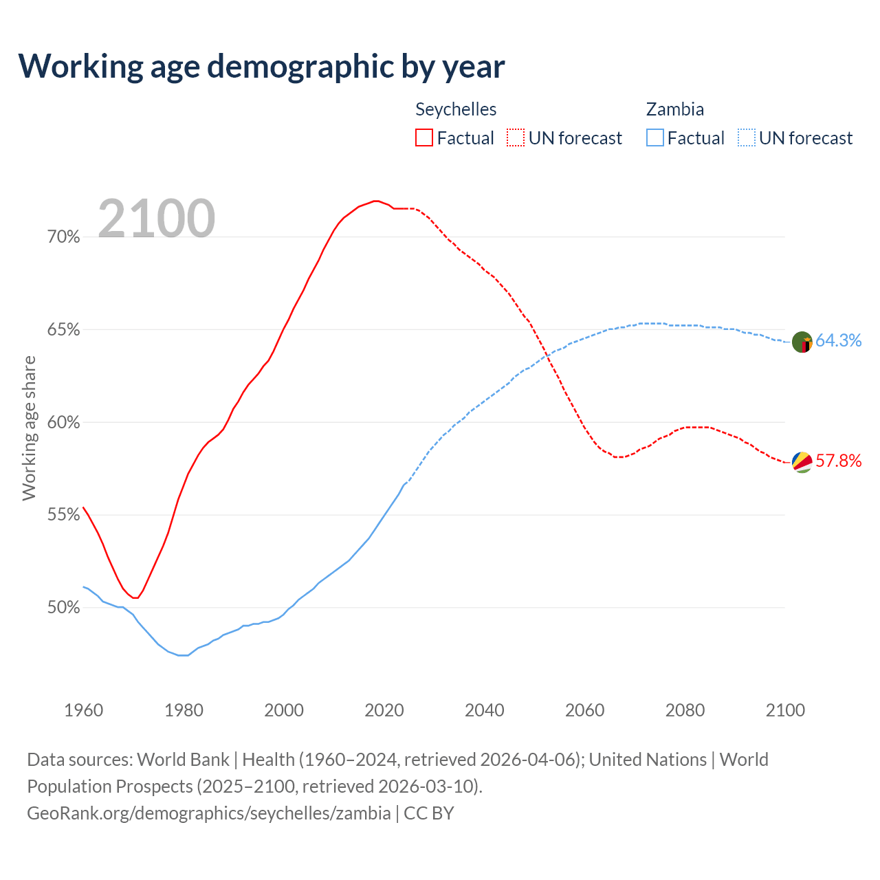 - The Seychelles has 90.3K working age adults (aged 15-64) vs 12.8M in Zambia.