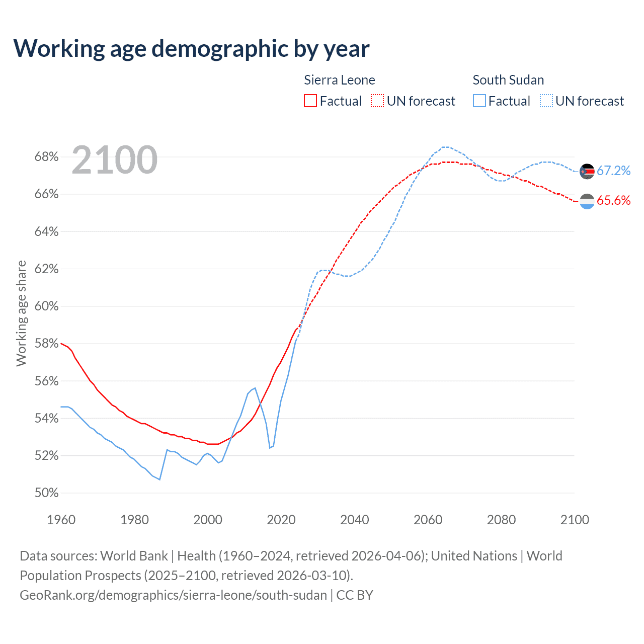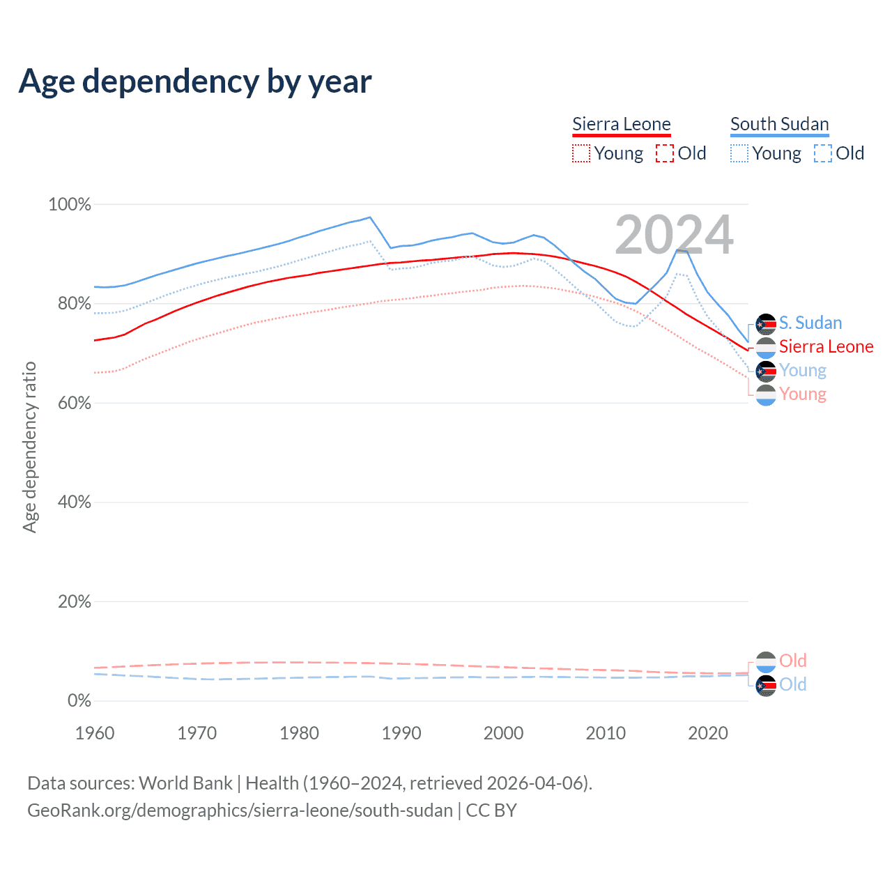 - The share of old-age demographic (65+) in Sierra Leone is 3.24% vs 2.99% in South Sudan.