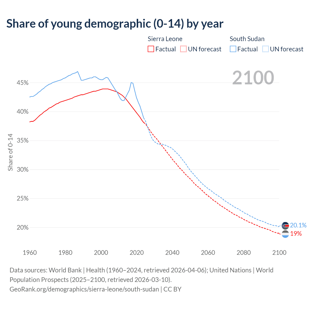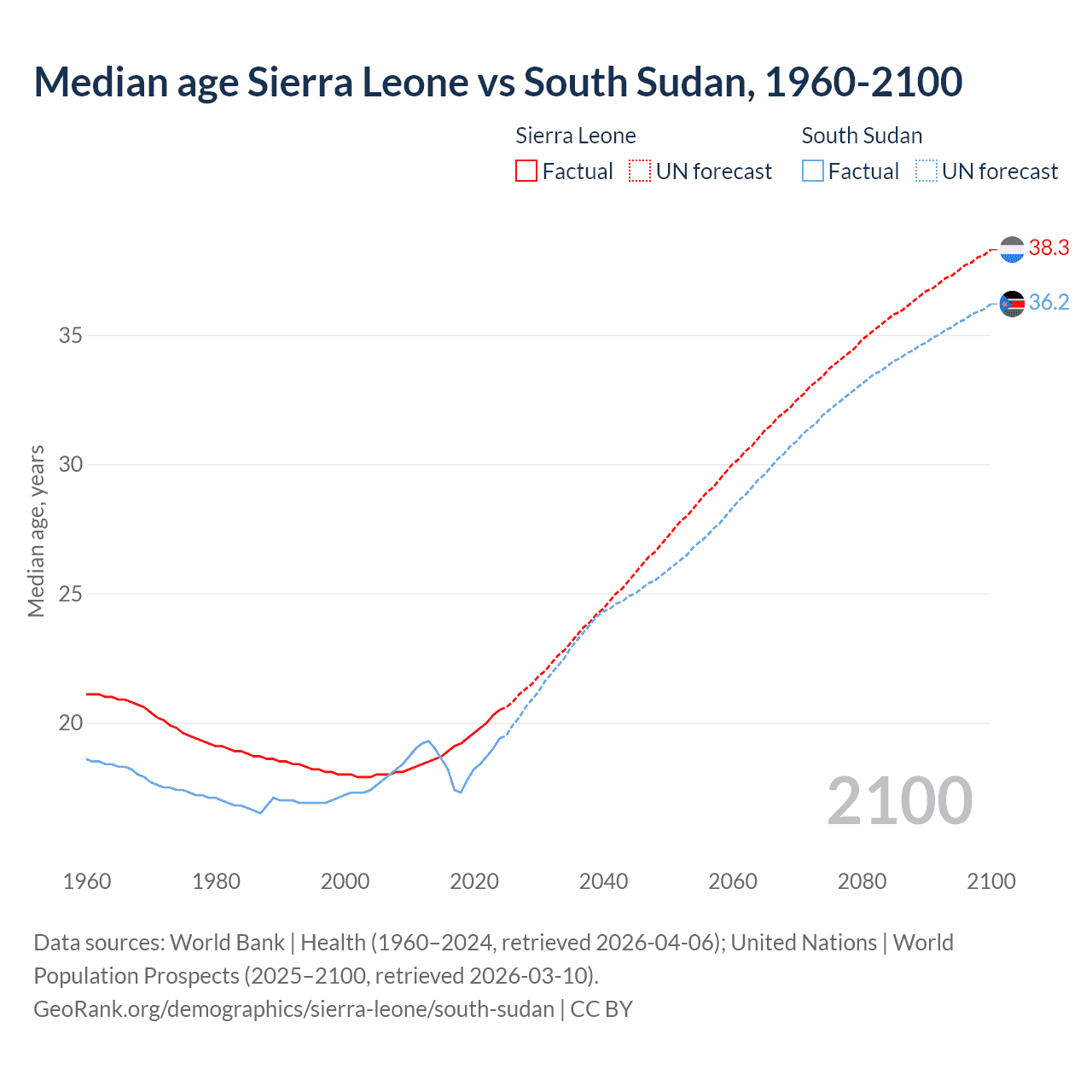 Median age Sierra Leone vs South Sudan, 1960-2100
