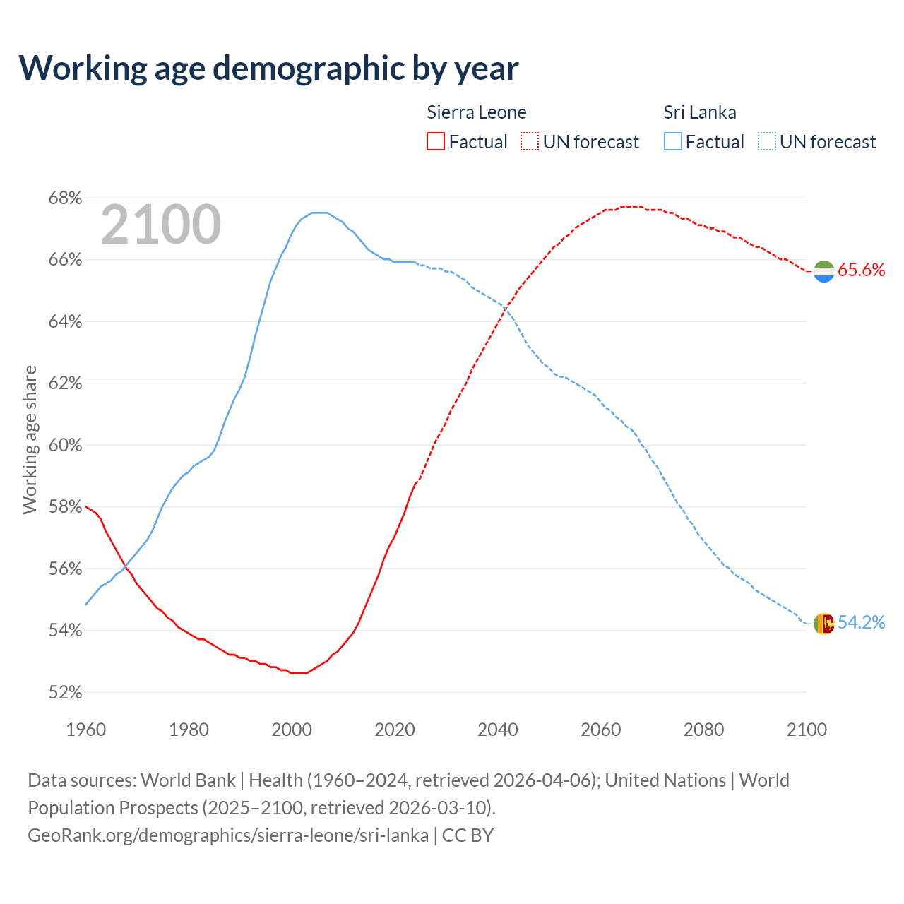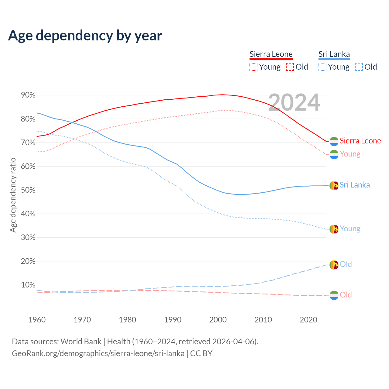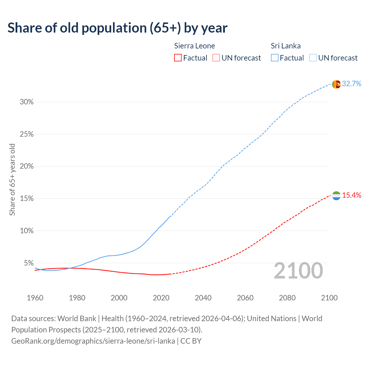 The share of older people aged 65 and over is 3.24% in Sierra Leone and 12.1% in Sri Lanka. Life expectancy in Sierra Leone compared to Sri Lanka .