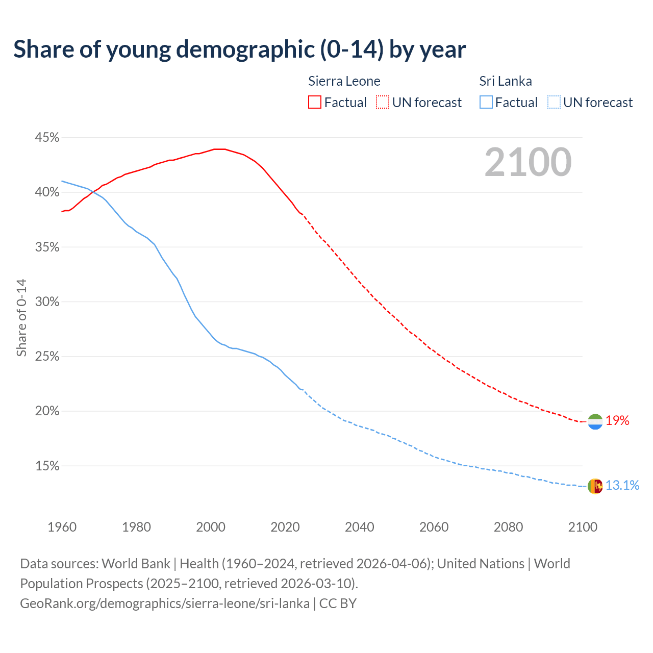 - The share of young demographic (0-15 years old) in Sierra Leone is 38.1% vs 22% in Sri Lanka.
