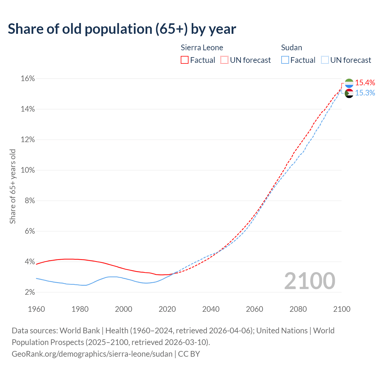 The share of older people aged 65 and over is 3.24% in Sierra Leone and 3.3% in Sudan. Life expectancy in Sierra Leone compared to Sudan .