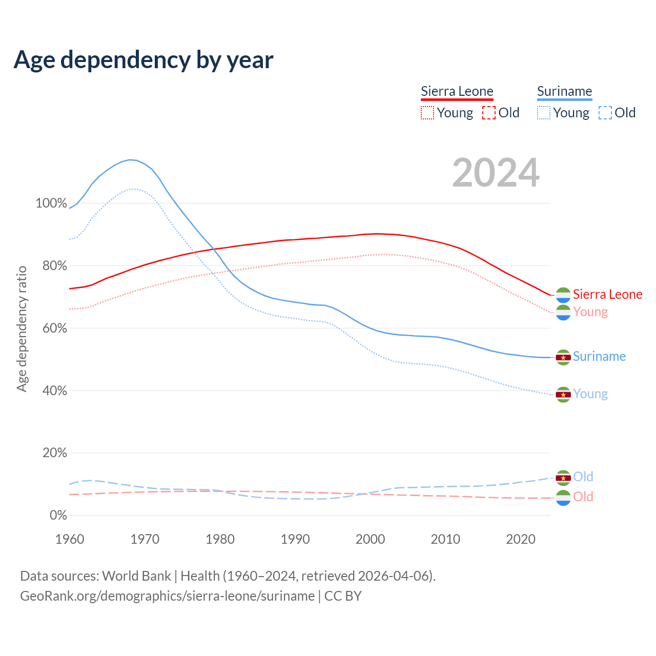 - Sierra Leone is ranked 161/196 by median age (oldest to youngest) vs 109/196 for Suriname.