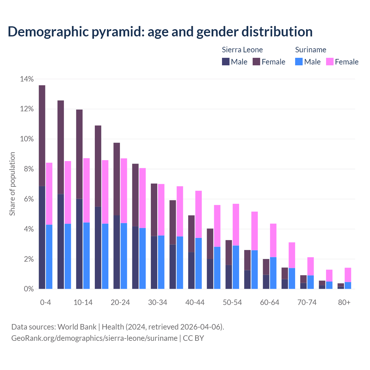 - As of 2026, the population of Sierra Leone is 9.05M vs 647K in Suriname - 14 times difference.