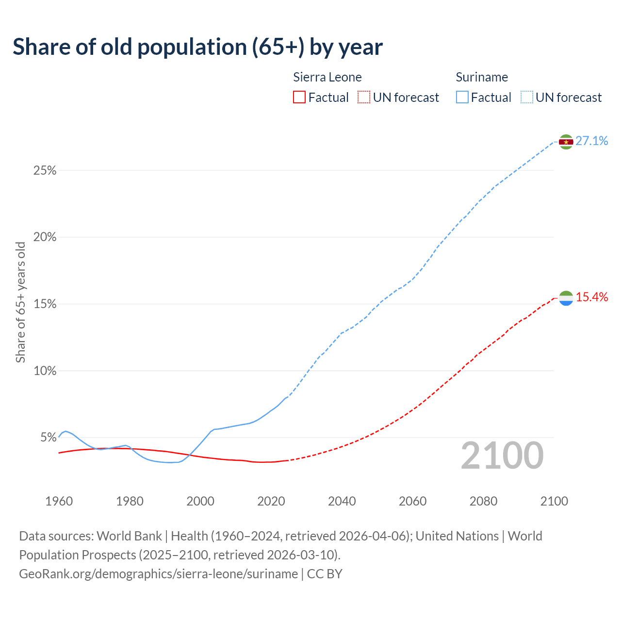 The share of older people aged 65 and over is 3.24% in Sierra Leone and 7.9% in Suriname. Life expectancy in Sierra Leone compared to Suriname .