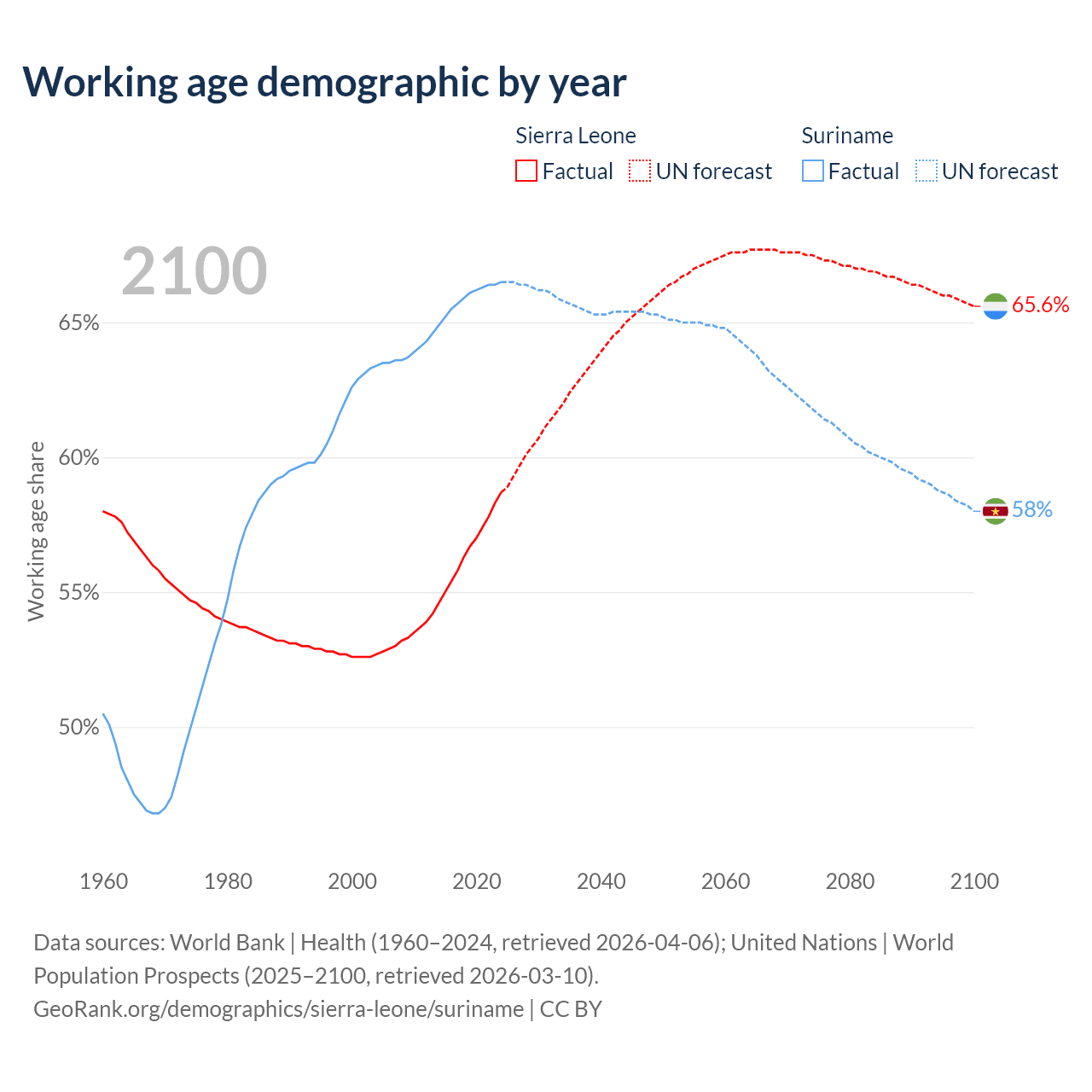 - The share of young demographic (0-15 years old) in Sierra Leone is 38.1% vs 25.6% in Suriname.