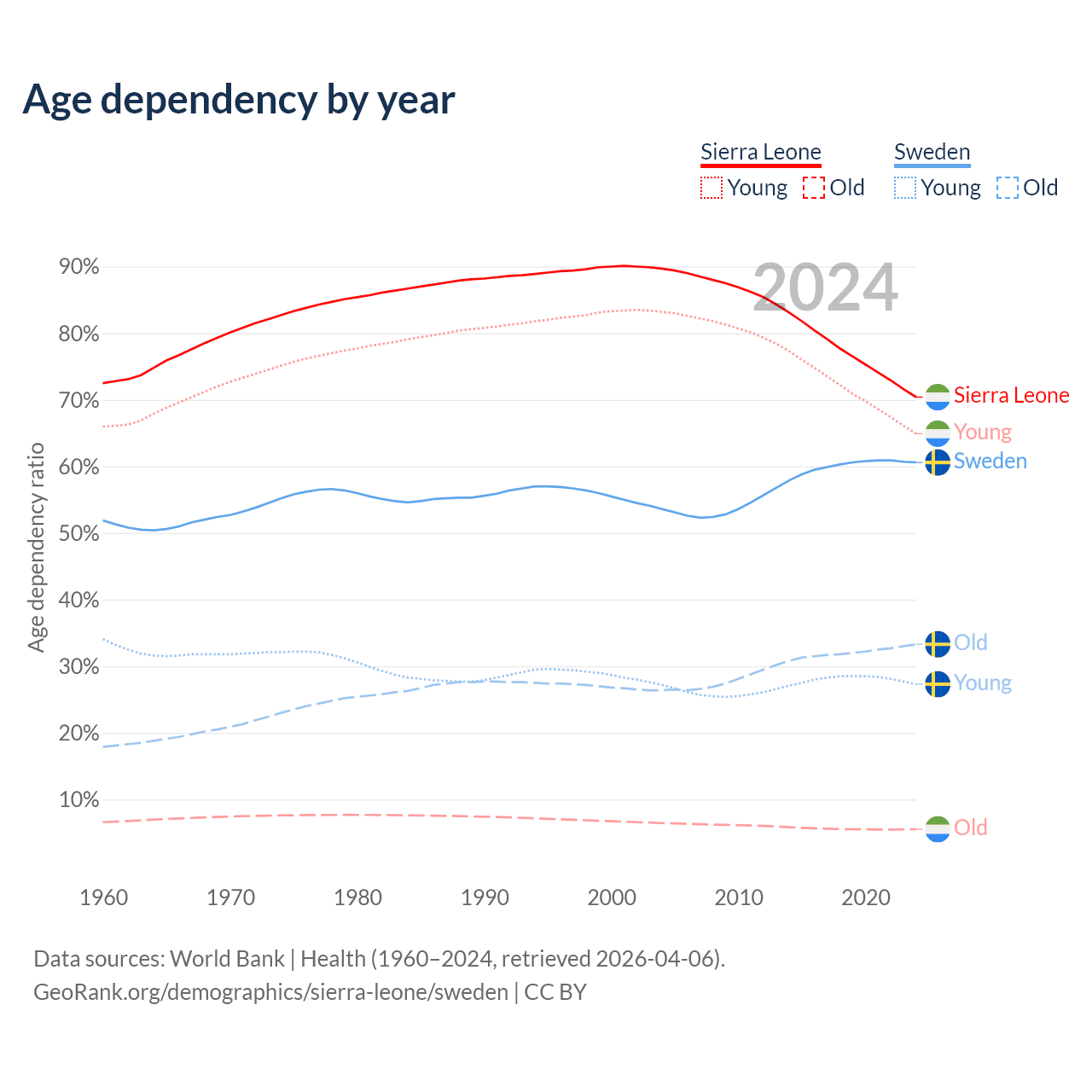 - The share of old-age demographic (65+) in Sierra Leone is 3.24% vs 20.7% in Sweden.