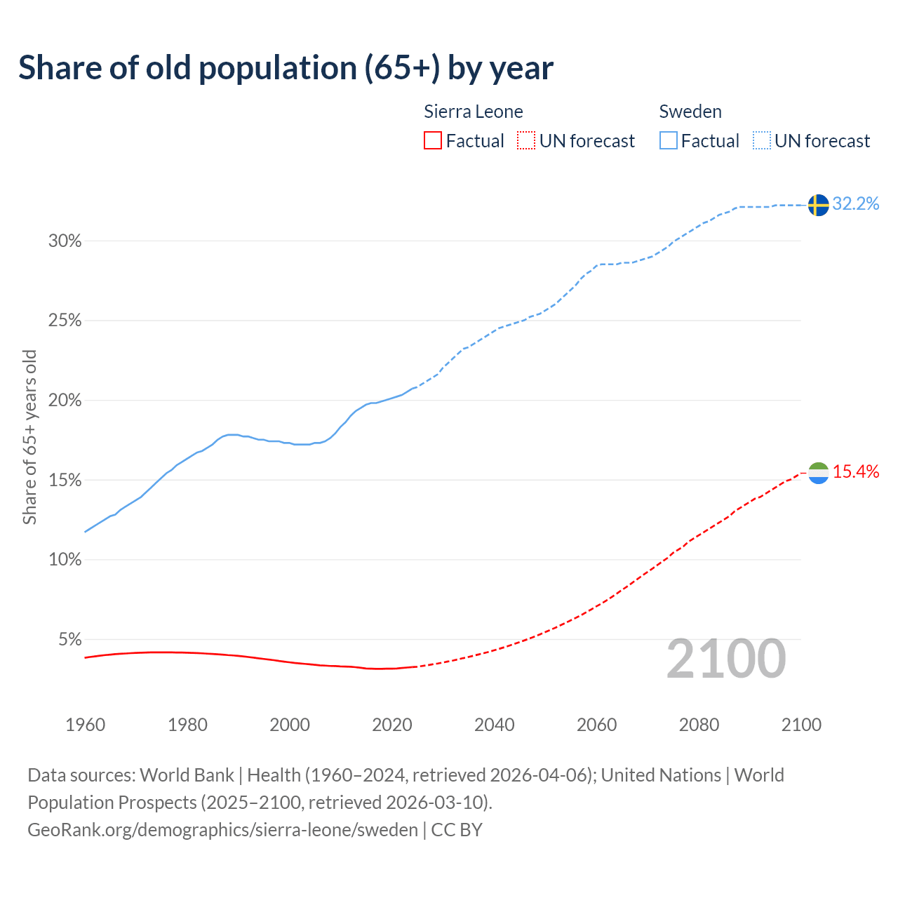 The share of older people aged 65 and over is 3.24% in Sierra Leone and 20.7% in Sweden. Life expectancy in Sierra Leone compared to Sweden .
