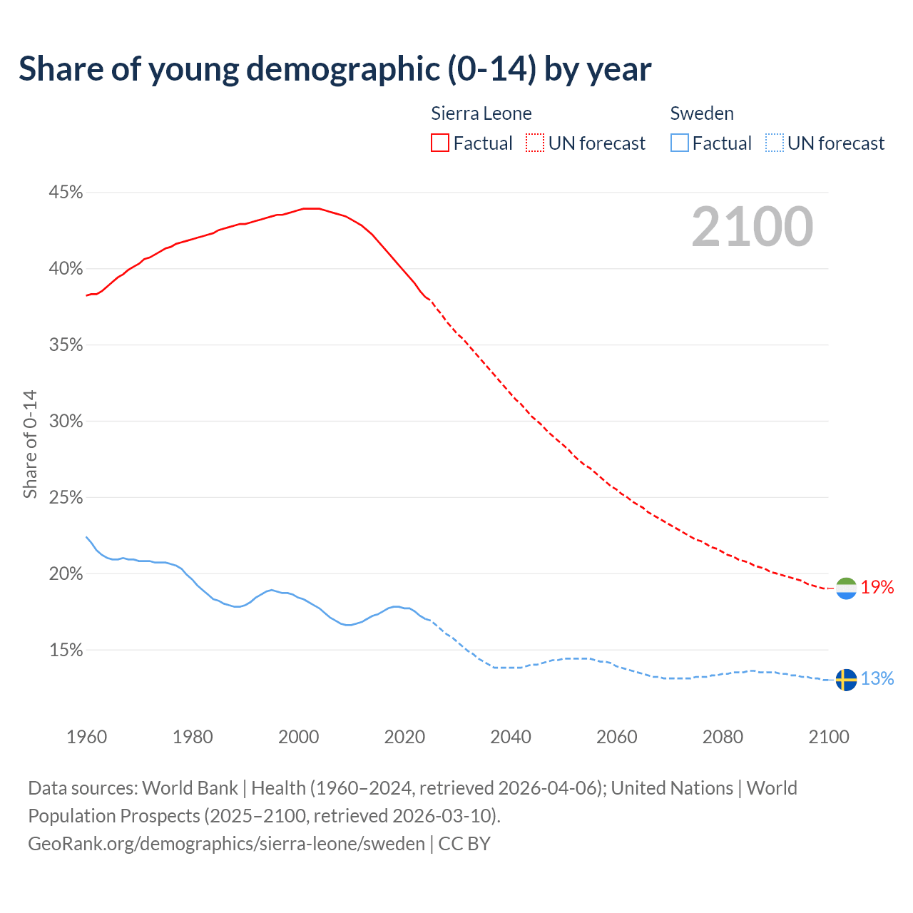 - The share of young demographic (0-15 years old) in Sierra Leone is 38.1% vs 17% in Sweden.