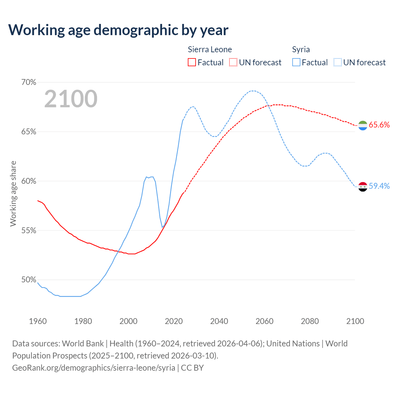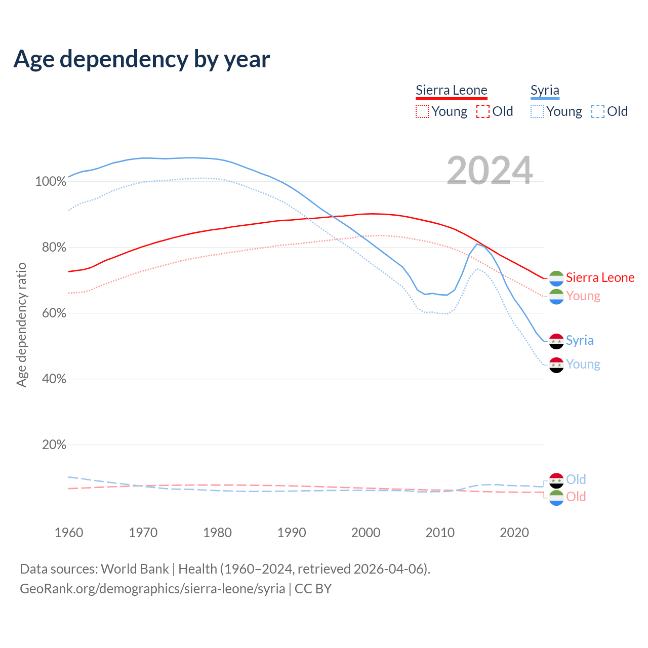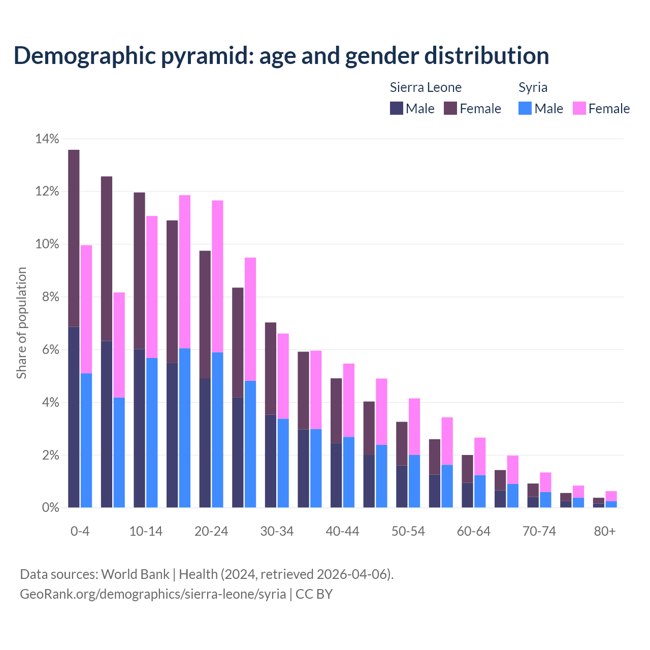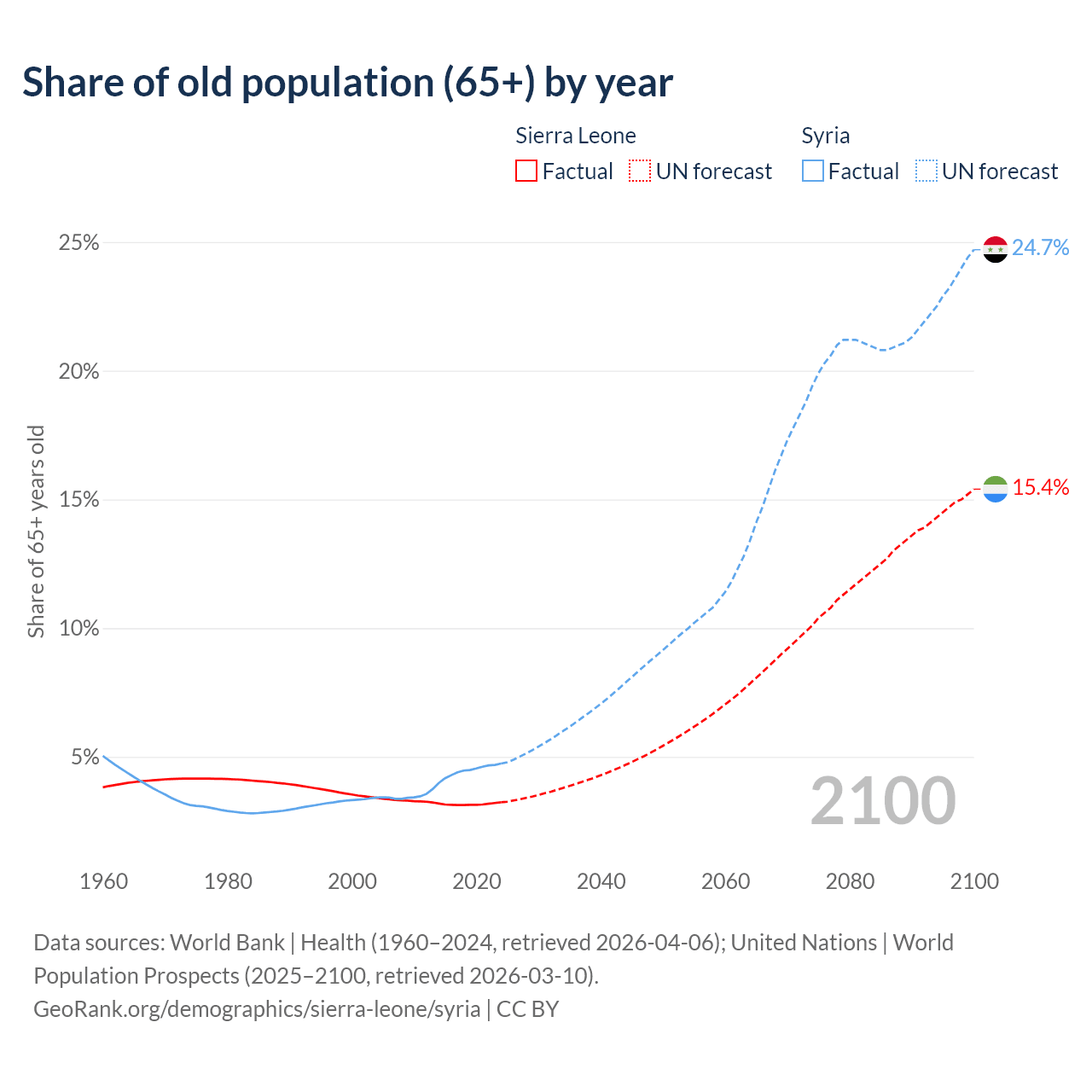 - The share of old-age demographic (65+) in Sierra Leone is 3.24% vs 4.74% in Syria.