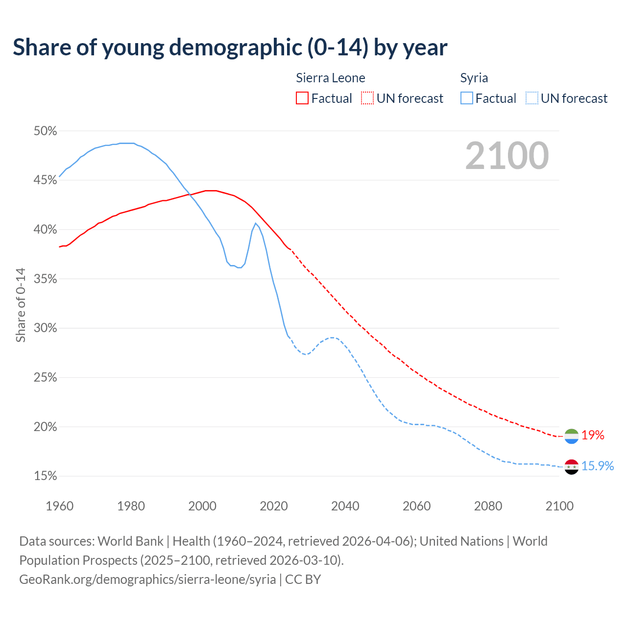 - The share of young demographic (0-15 years old) in Sierra Leone is 38.1% vs 29.2% in Syria.