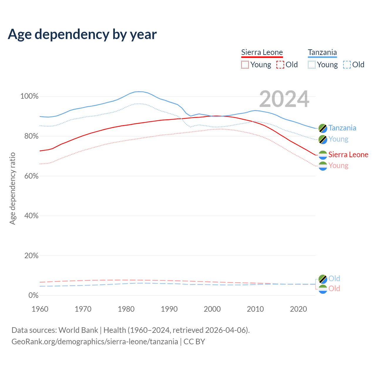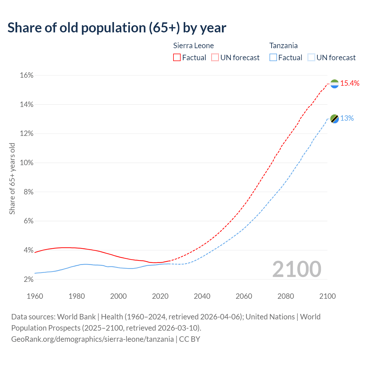 The share of older people aged 65 and over is 3.24% in Sierra Leone and 3.05% in Tanzania. Life expectancy in Sierra Leone compared to Tanzania .