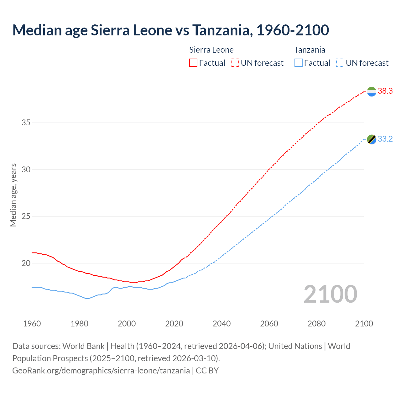 - The median age in Sierra Leone is 20.5 years compared to 18.4 years in Tanzania.