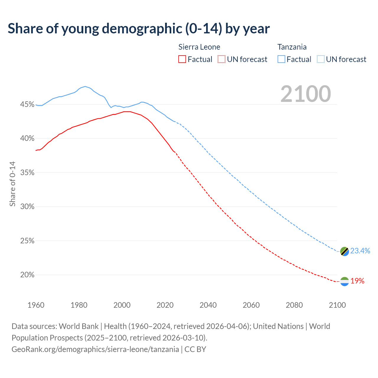 - The share of young demographic (0-15 years old) in Sierra Leone is 38.1% vs 42.5% in Tanzania.