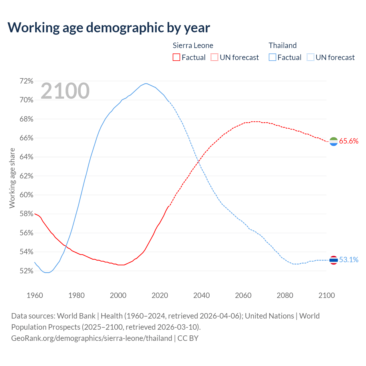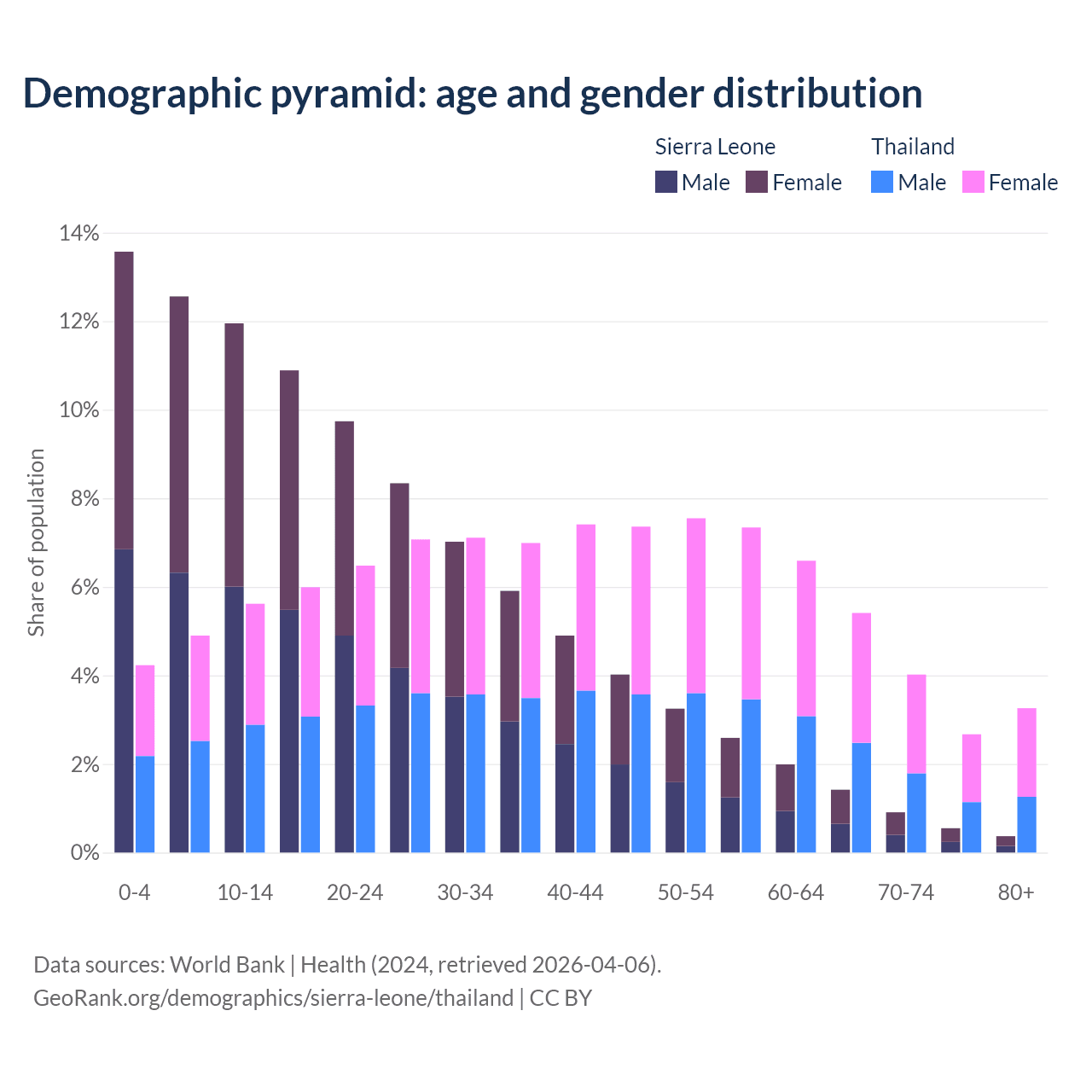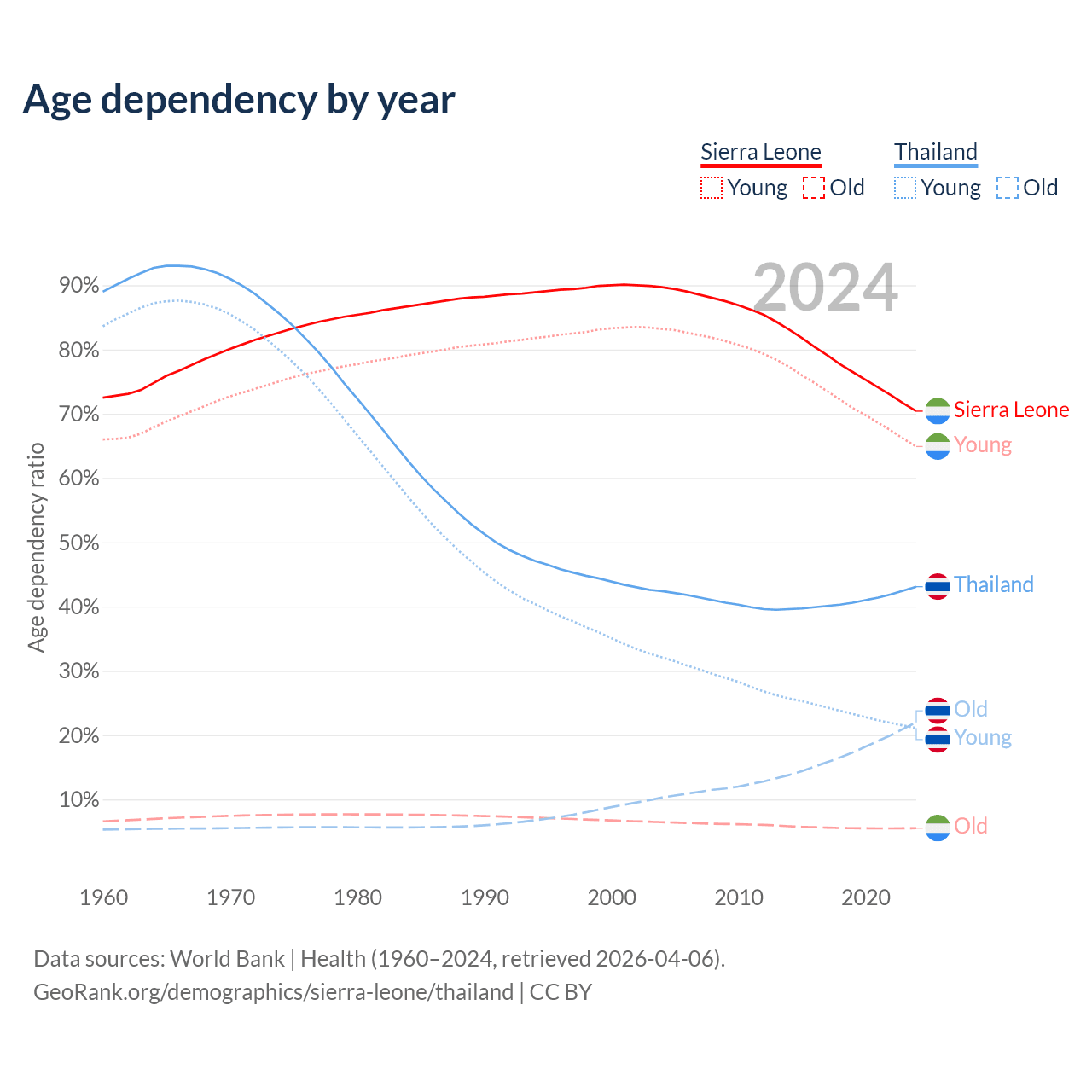 - Sierra Leone is ranked 161/196 by median age (oldest to youngest) vs 40/196 for Thailand.