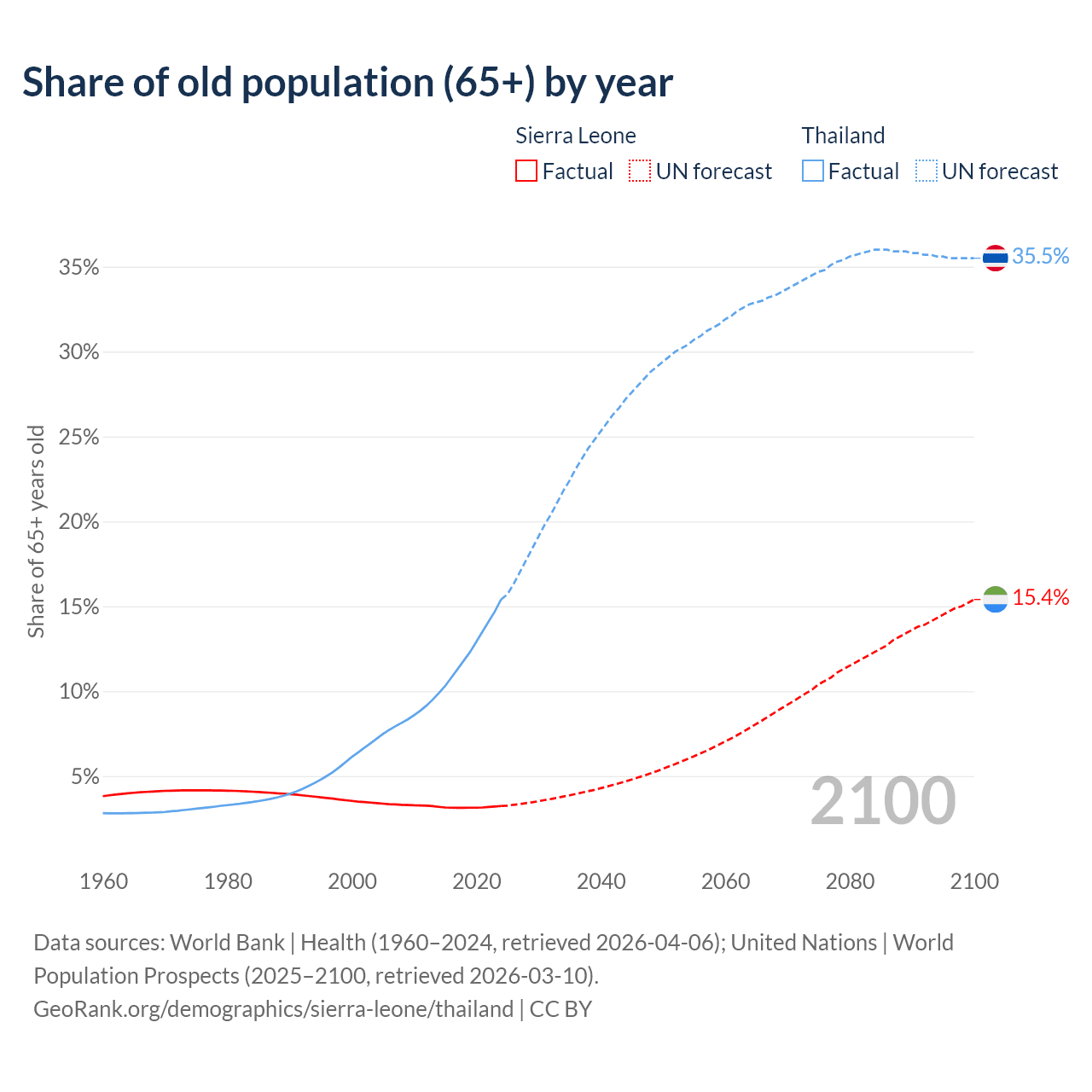 The share of older people aged 65 and over is 3.24% in Sierra Leone and 15.4% in Thailand. Life expectancy in Sierra Leone compared to Thailand .