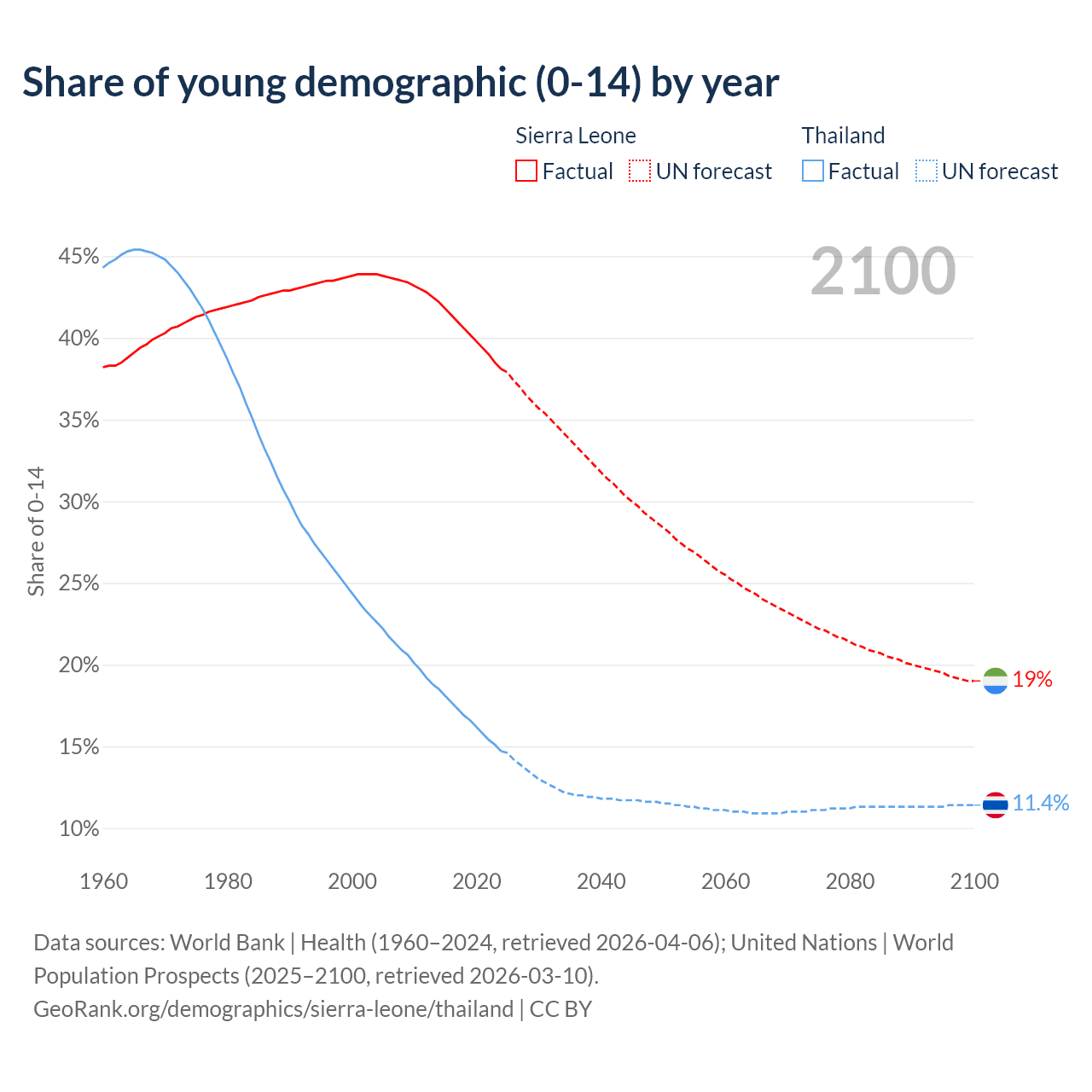 - The share of young demographic (0-15 years old) in Sierra Leone is 38.1% vs 14.7% in Thailand.