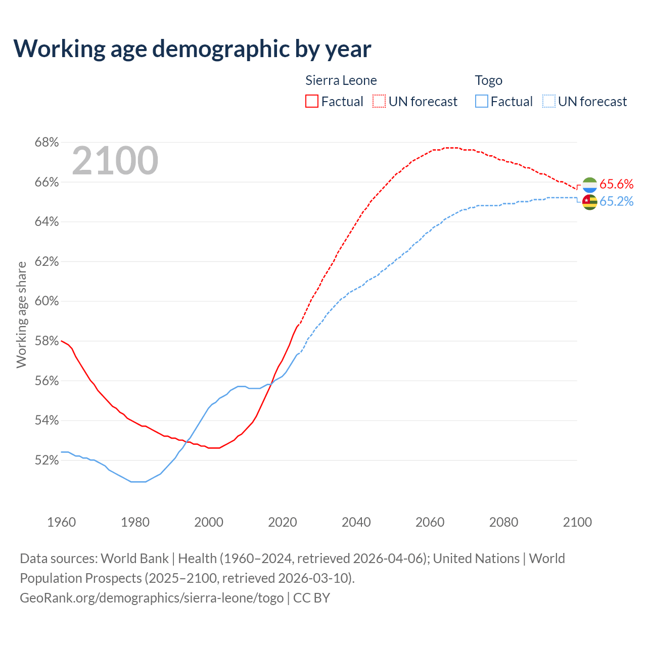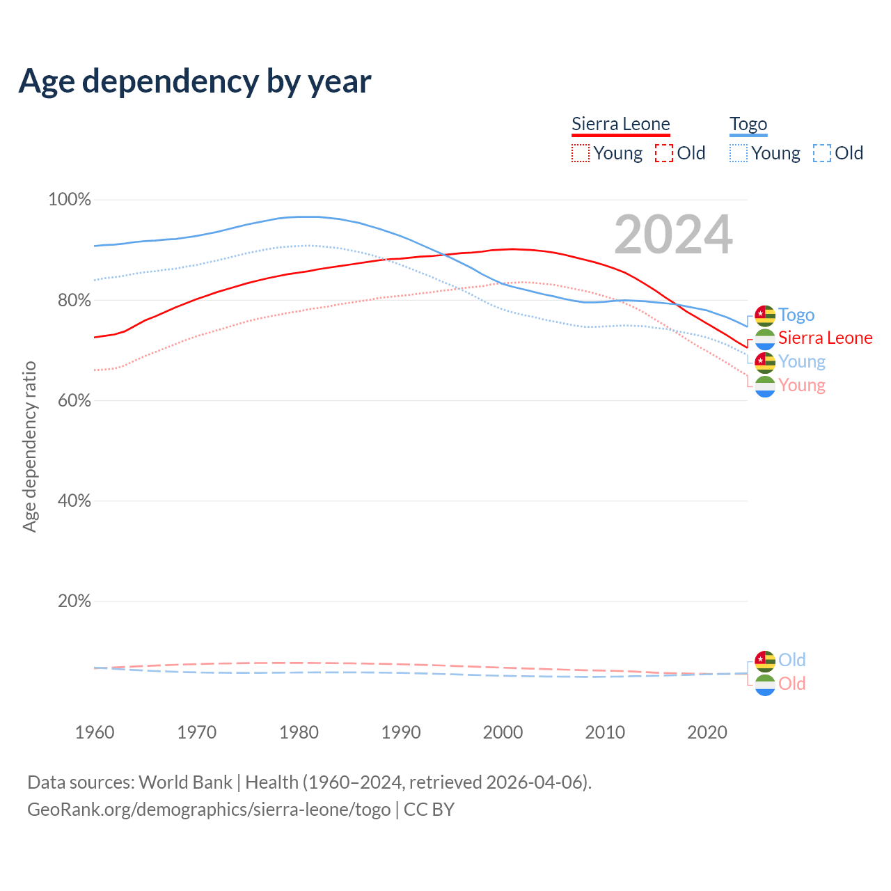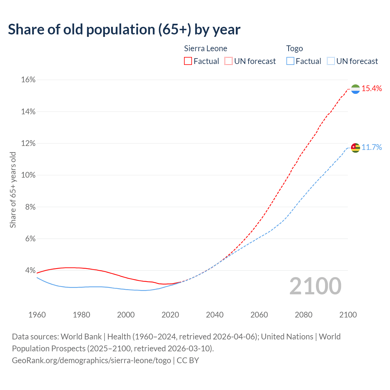 - The share of old-age demographic (65+) in Sierra Leone is 3.24% vs 3.21% in Togo.