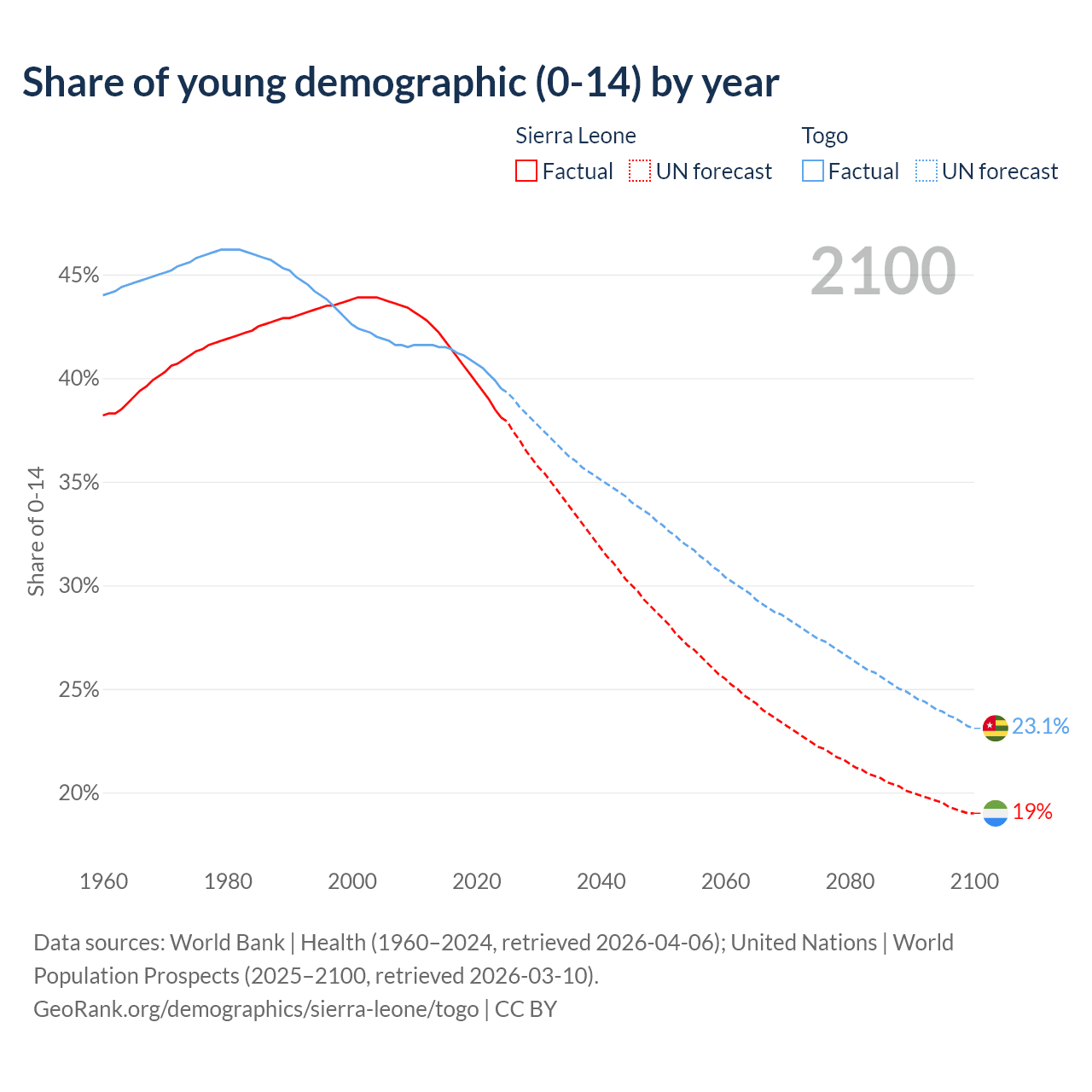 - The share of young demographic (0-15 years old) in Sierra Leone is 38.1% vs 39.5% in Togo.