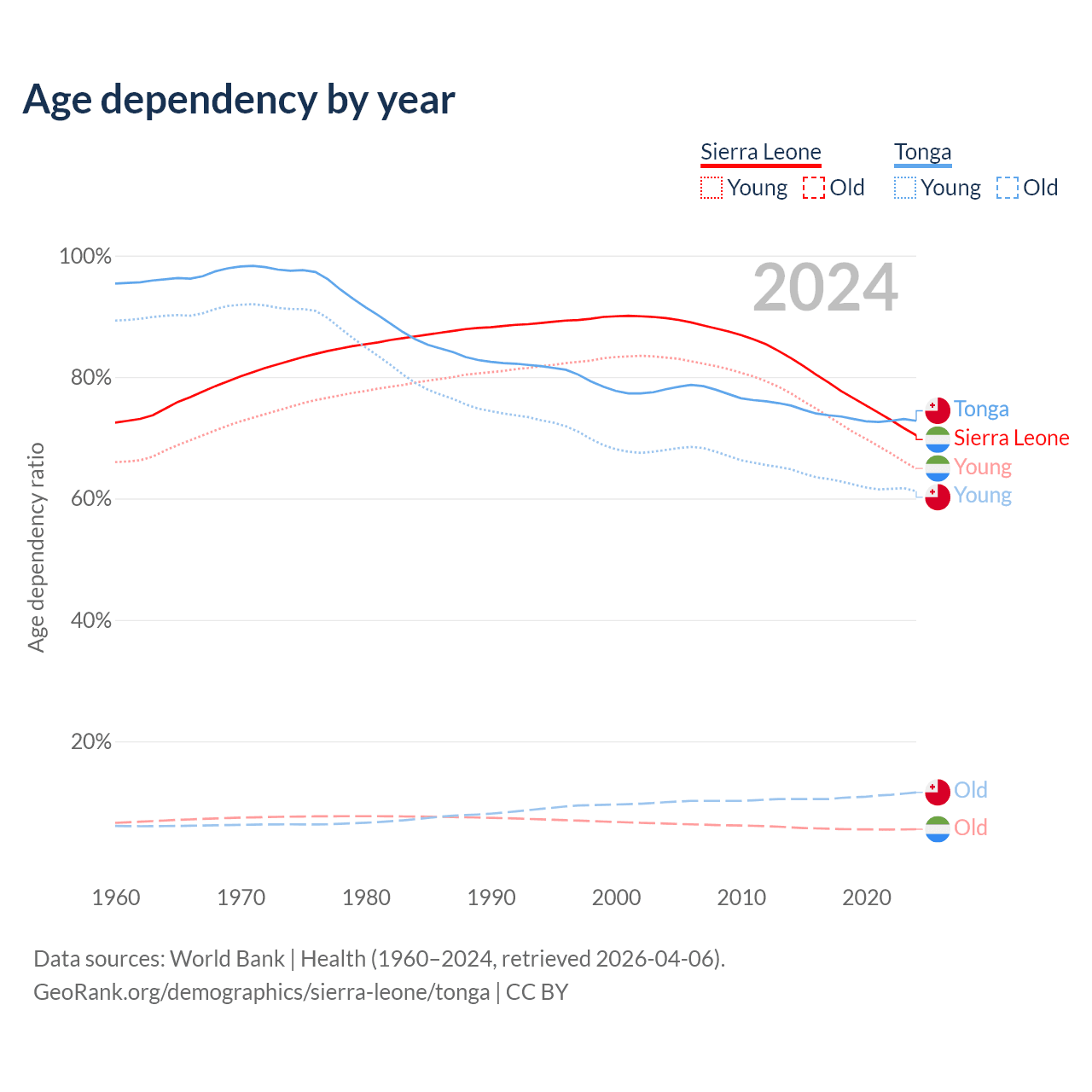 - The share of old-age demographic (65+) in Sierra Leone is 3.24% vs 6.72% in Tonga.