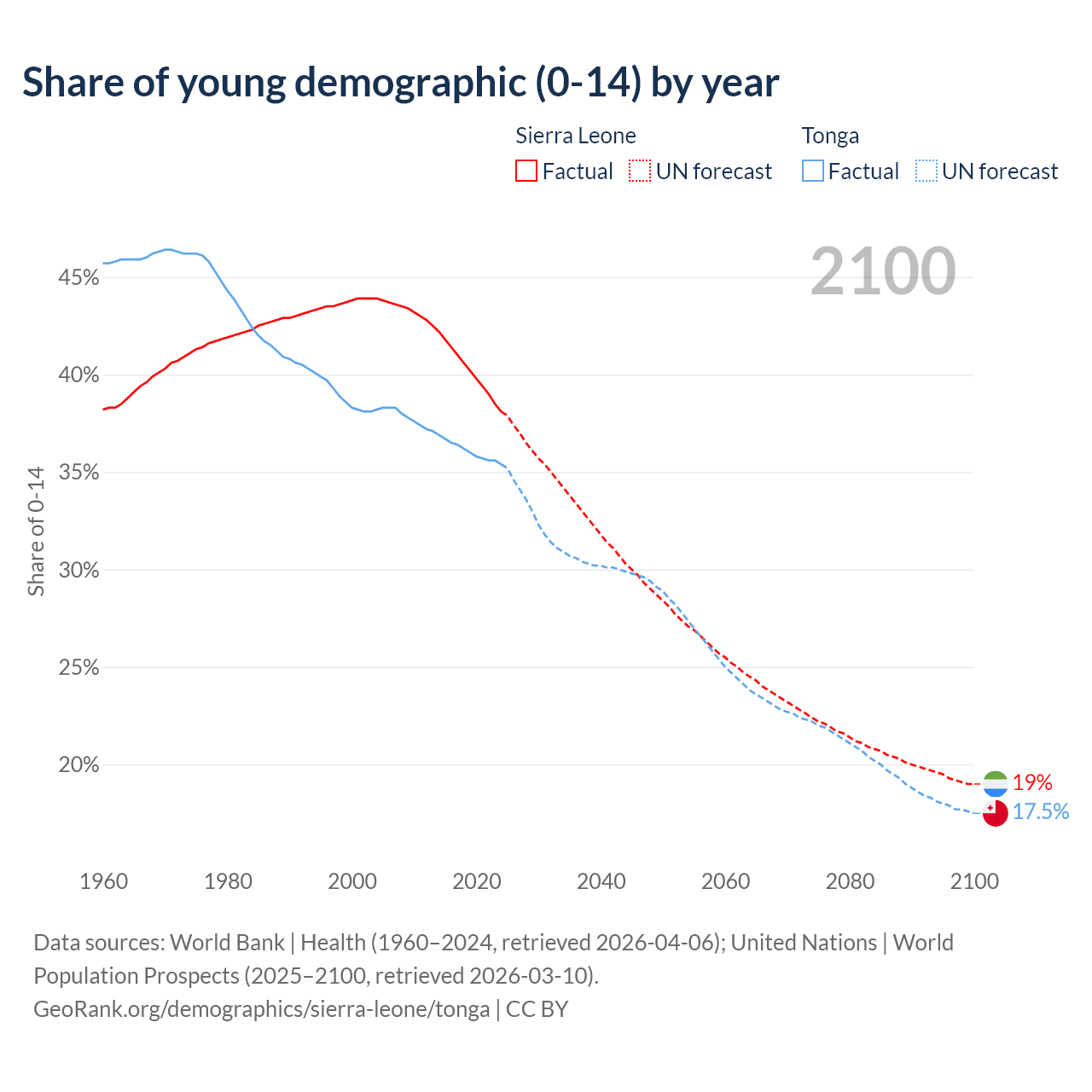 - The share of young demographic (0-15 years old) in Sierra Leone is 38.1% vs 35.4% in Tonga.