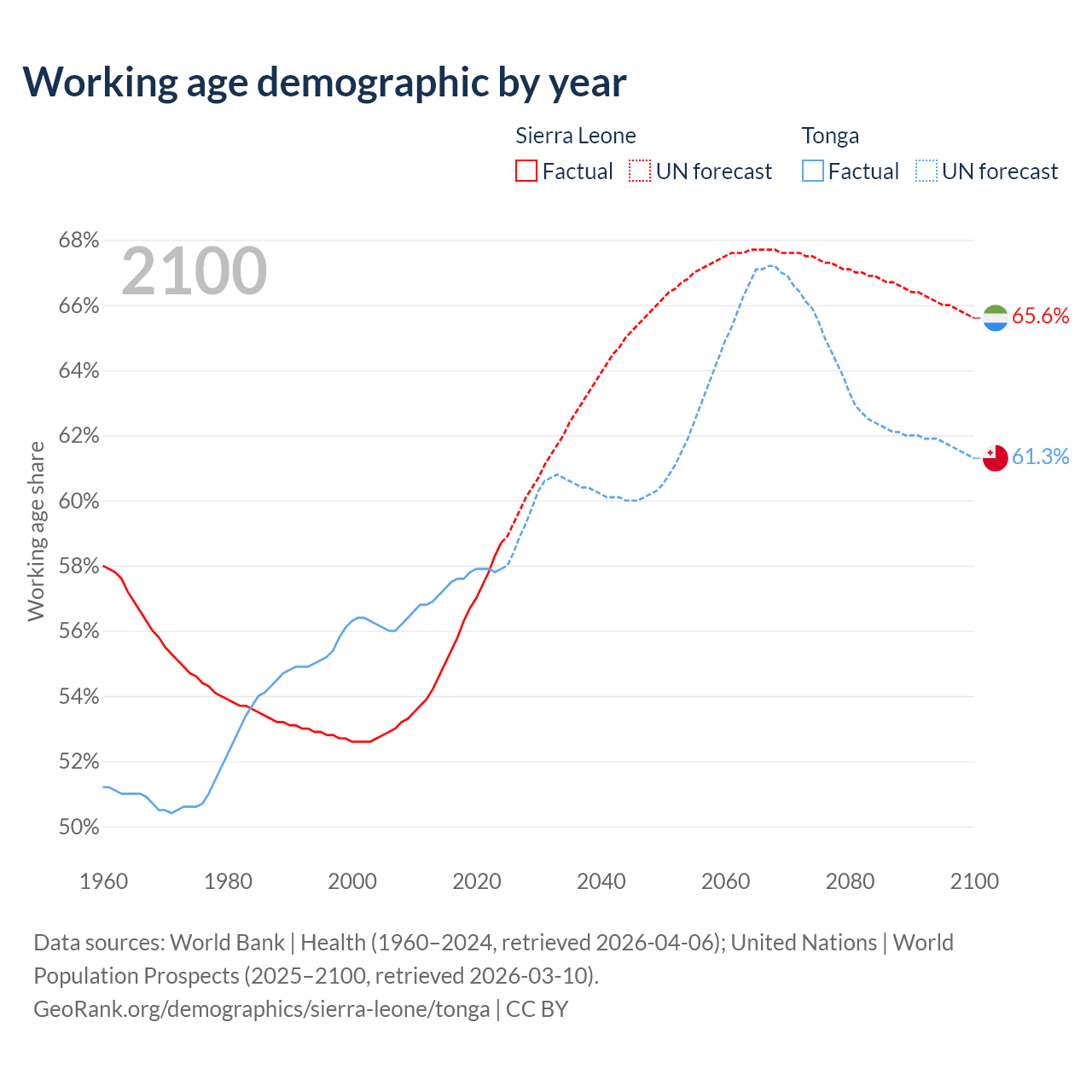 - Sierra Leone has 5.31M working age adults (aged 15-64) vs 59.8K in Tonga.