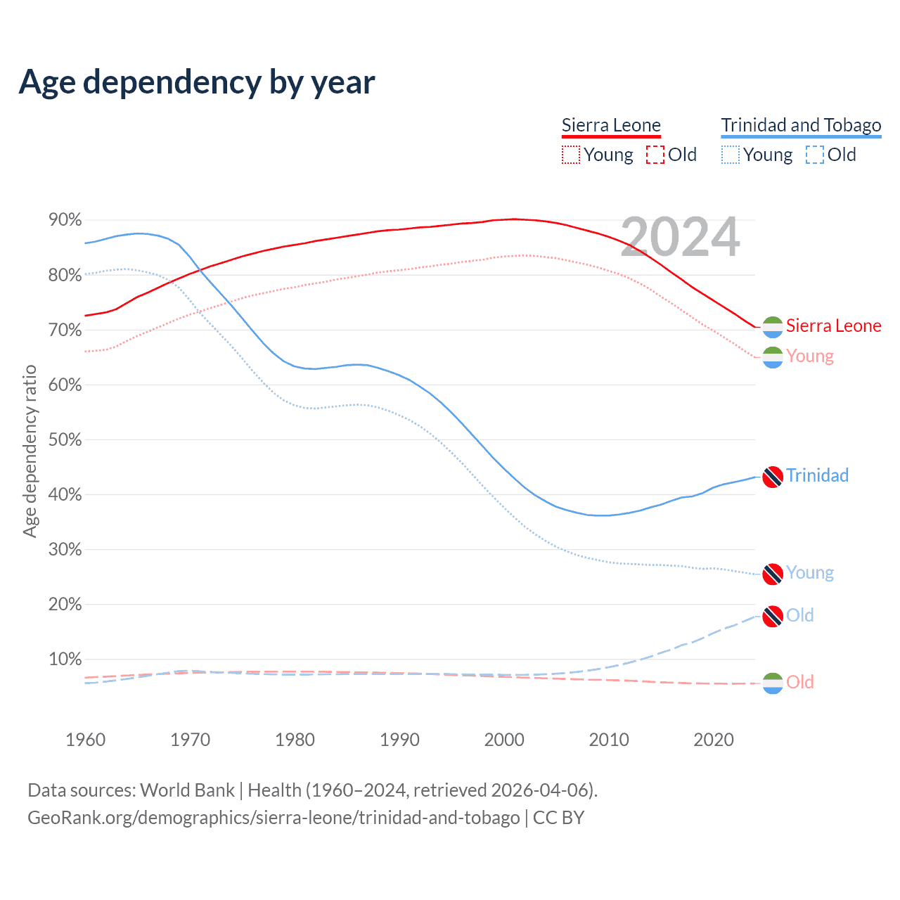 - Sierra Leone is ranked 161/196 by median age (oldest to youngest) vs 58/196 for Trinidad and Tobago.