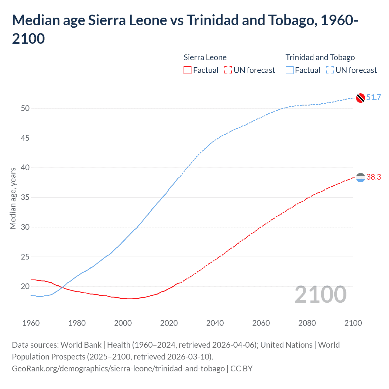 - The median age in Sierra Leone is 20.5 years compared to 38.2 years in Trinidad and Tobago.