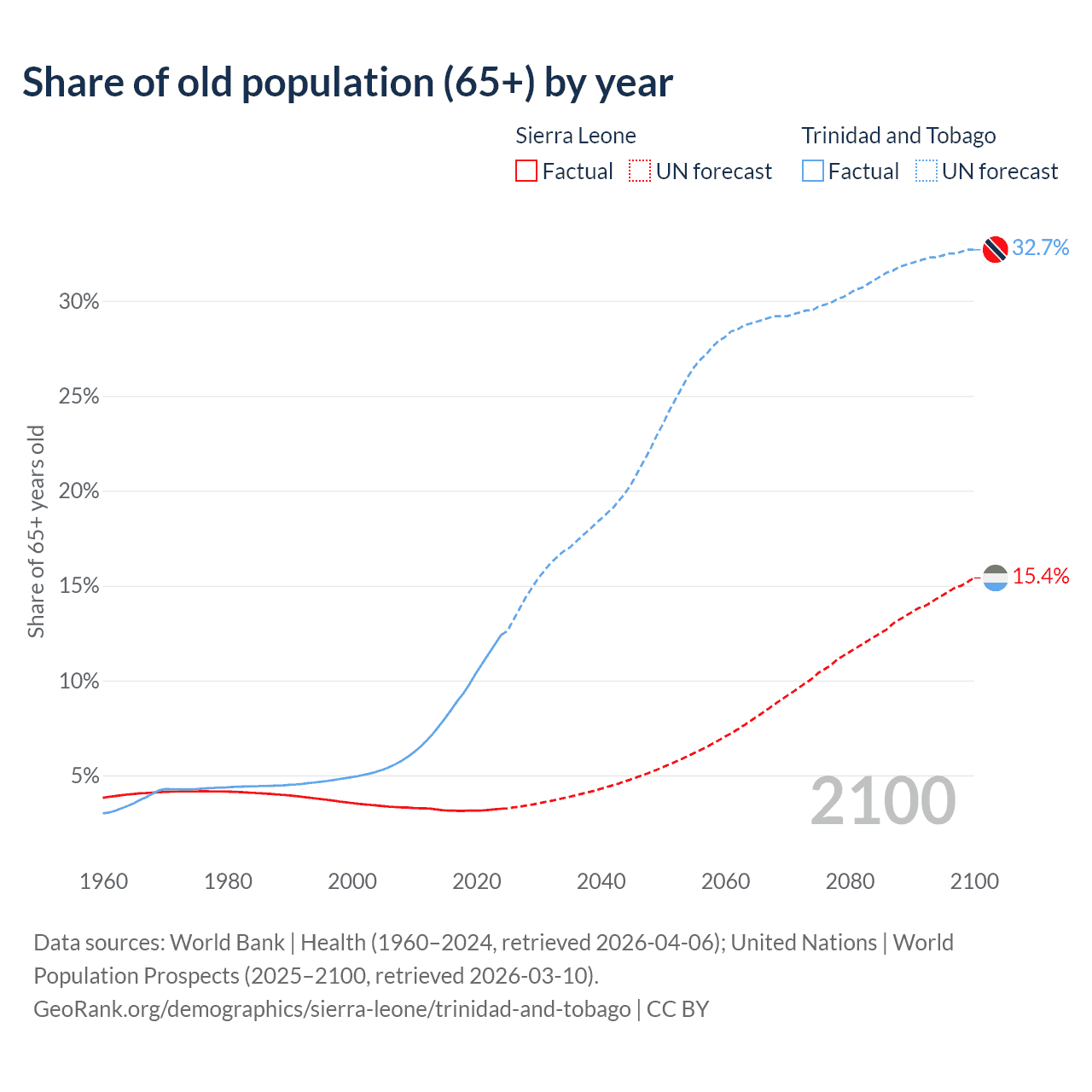 The share of older people aged 65 and over is 3.24% in Sierra Leone and 12.4% in Trinidad and Tobago. Life expectancy in Sierra Leone compared to Trinidad and Tobago .
