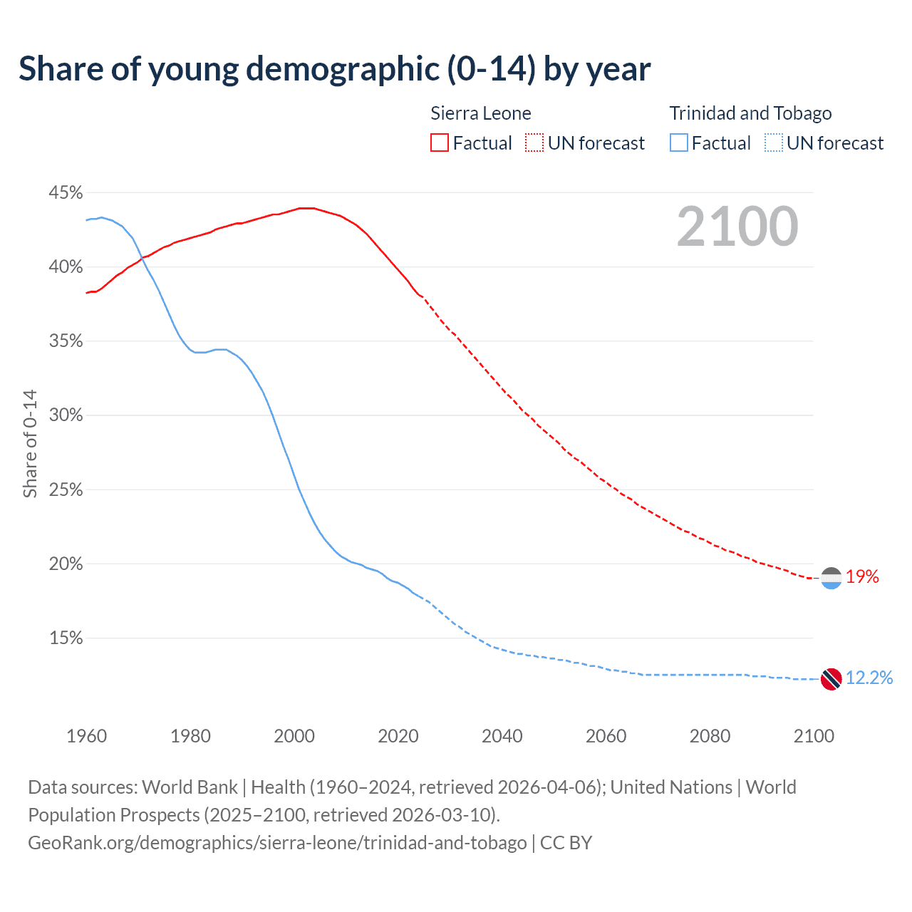 - The share of young demographic (0-15 years old) in Sierra Leone is 38.1% vs 17.8% in Trinidad and Tobago.