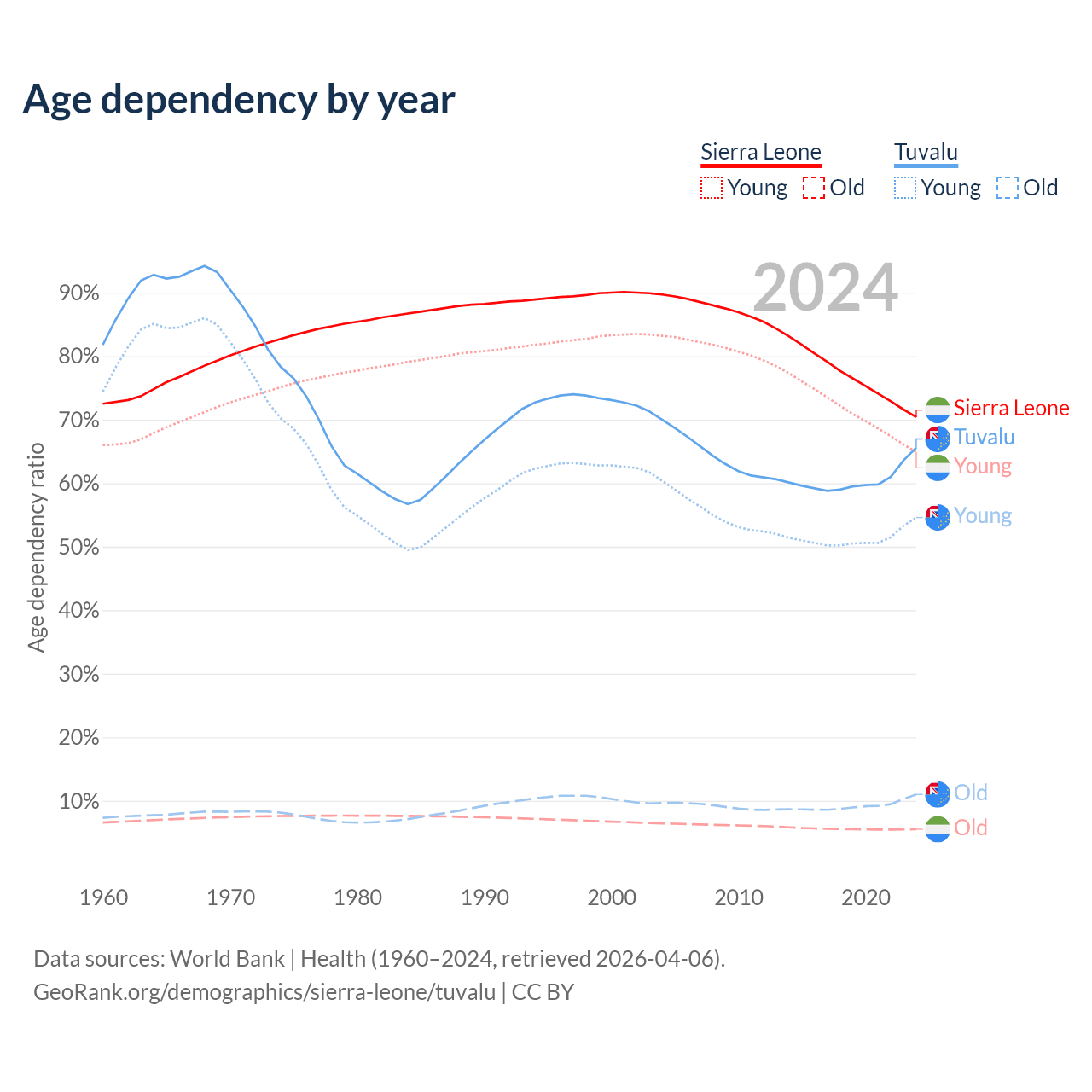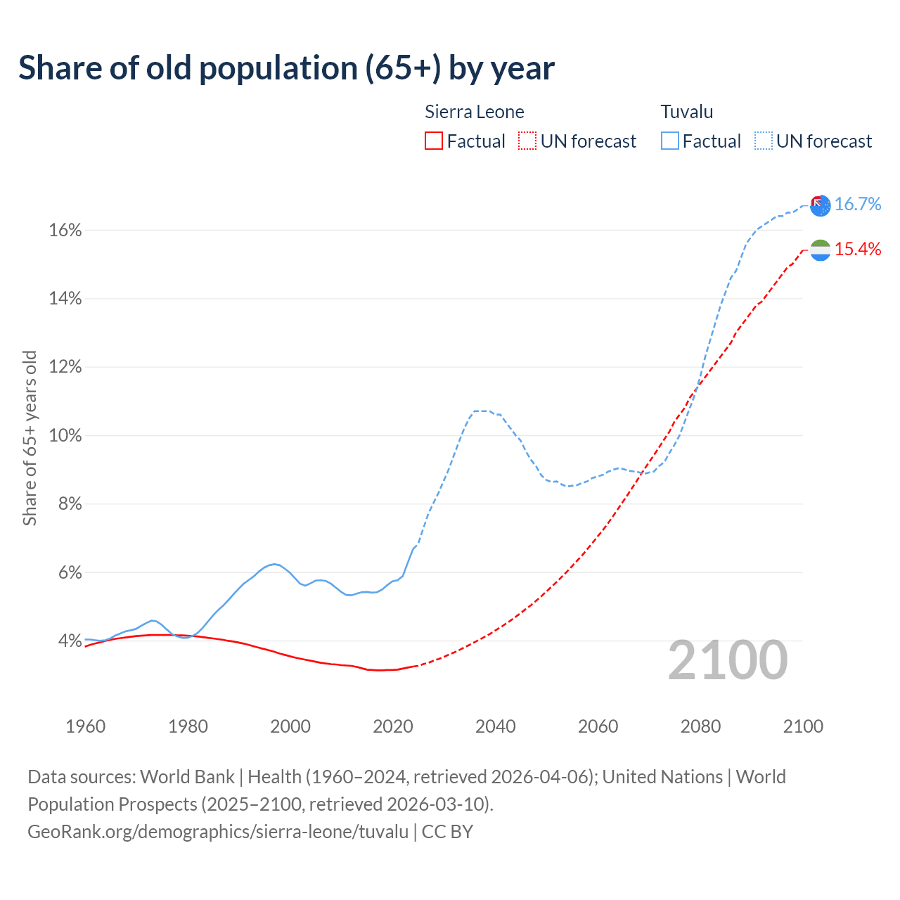 - The share of old-age demographic (65+) in Sierra Leone is 3.24% vs 6.67% in Tuvalu.