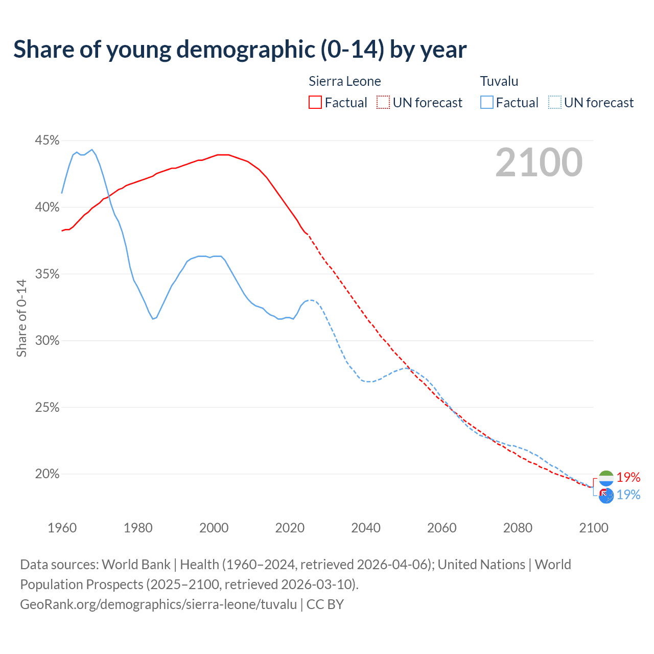 - The share of young demographic (0-15 years old) in Sierra Leone is 38.1% vs 32.9% in Tuvalu.